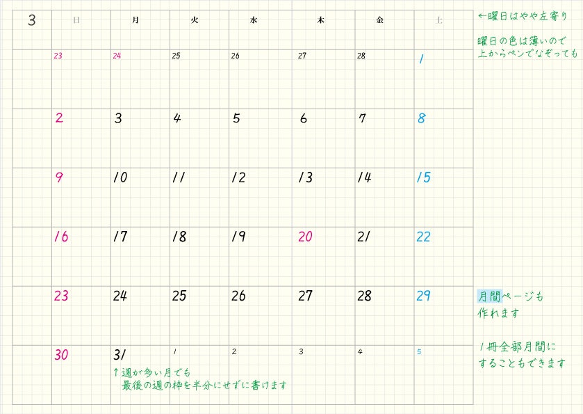 1日が1枠だと小さすぎる時は、このように1日2枠使って約半月分(3週間分)の月間を作ることもできます。