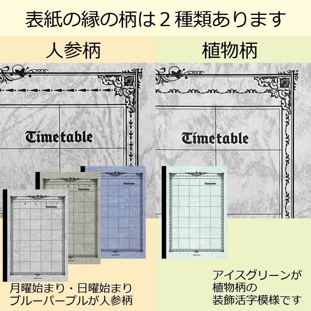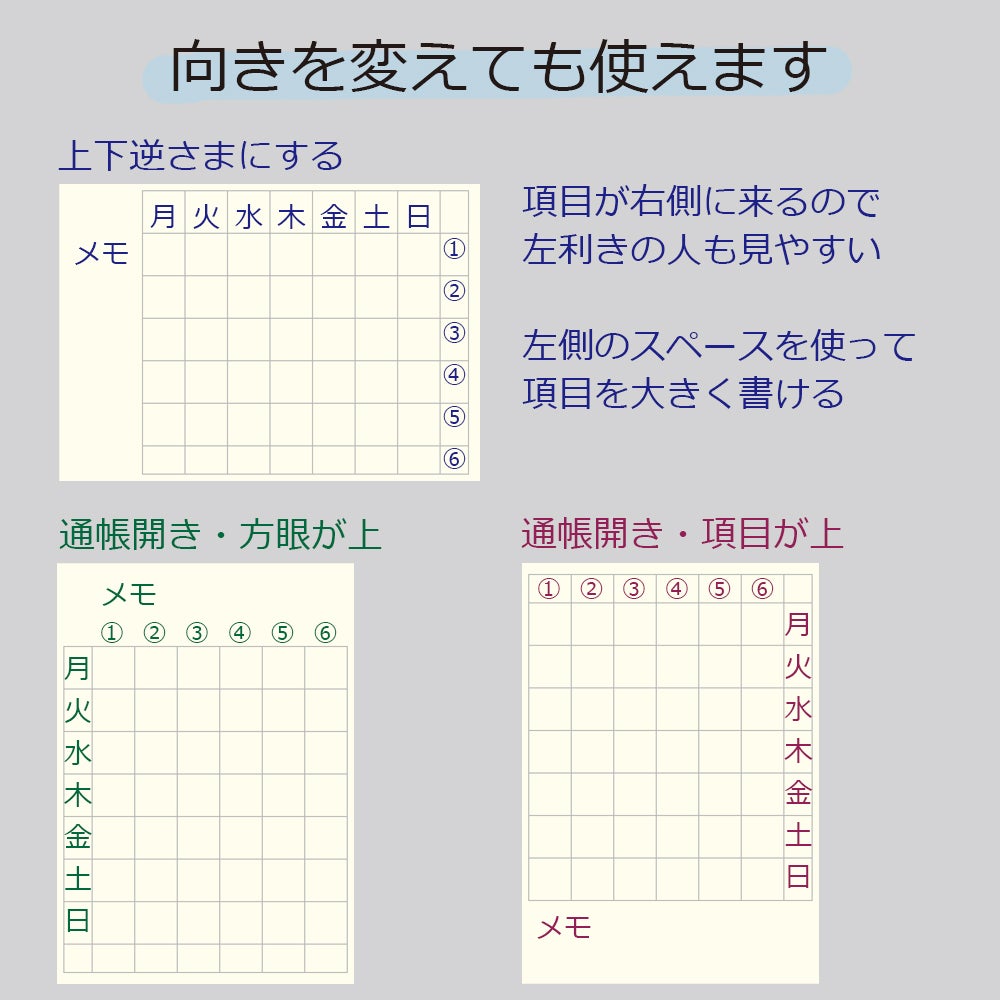日付なしで時間割枠だけの大人の時間割もあり、使い方に決まりはありません。逆さまにして使うこともできます。