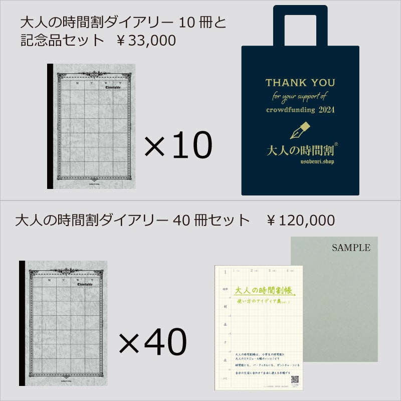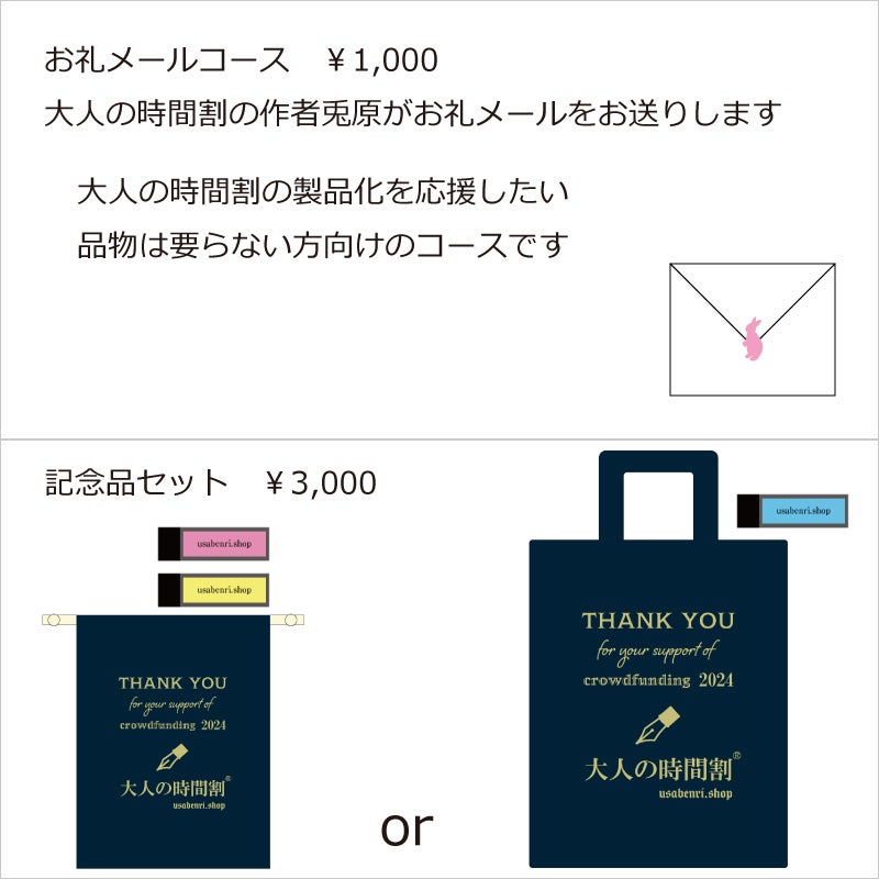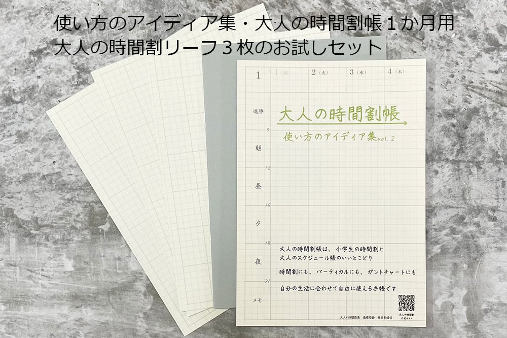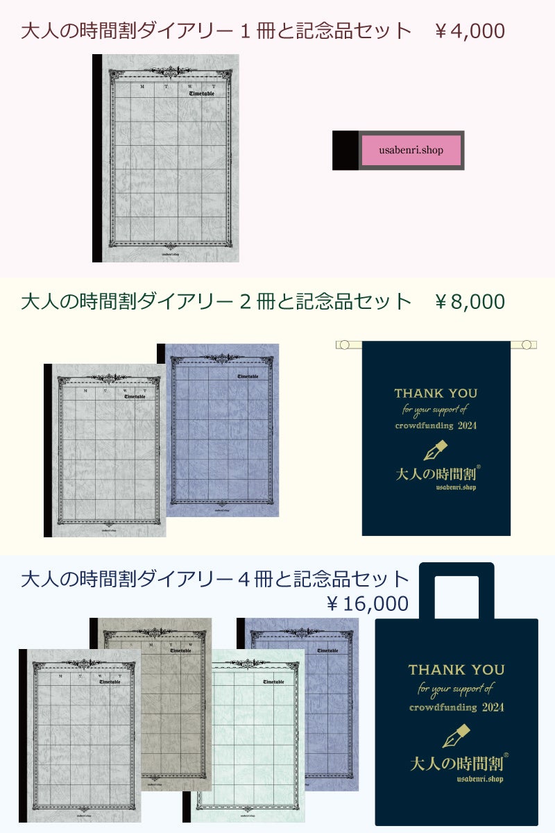 大人の時間割ダイアリーを初めてご覧になった方、気になるけれど使いこなせるかなと迷っていらっしゃる方のために、通販「うさぎの便利グッズ屋」ではクラウドファンディング期間中、上のお試しセットを500円(+送料300円)という少しお得なお値段でご用意しております。