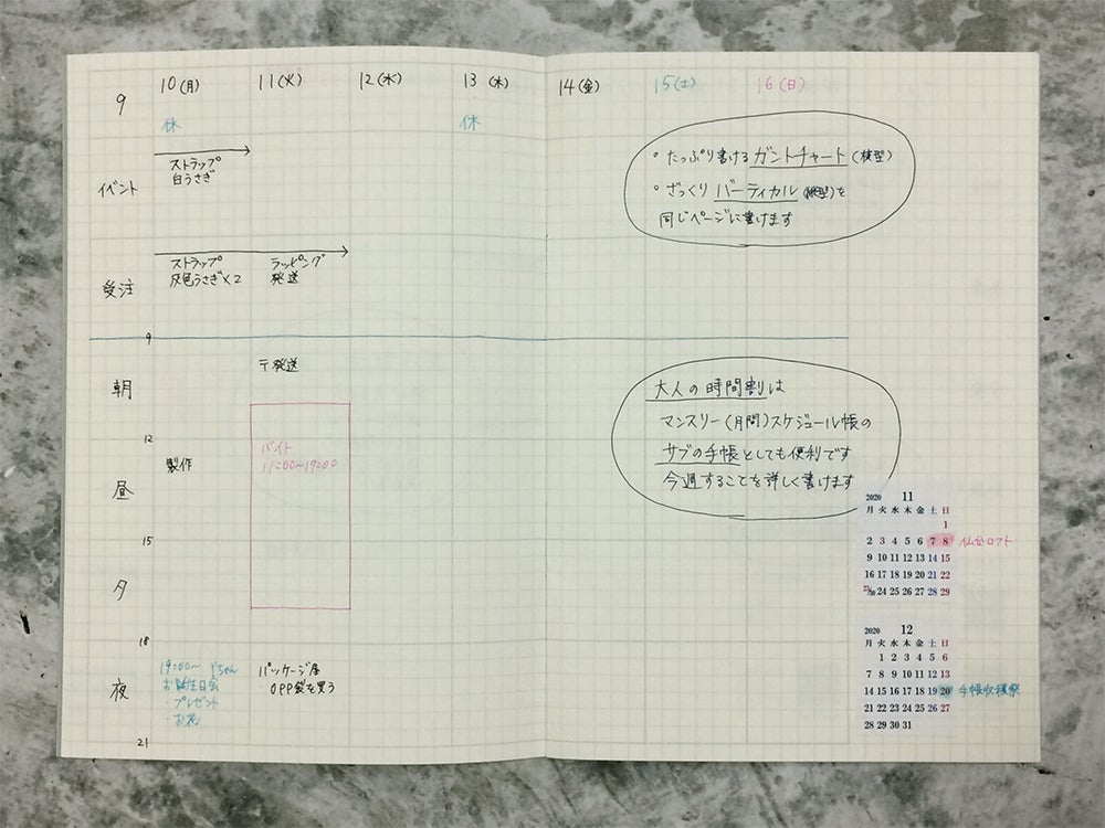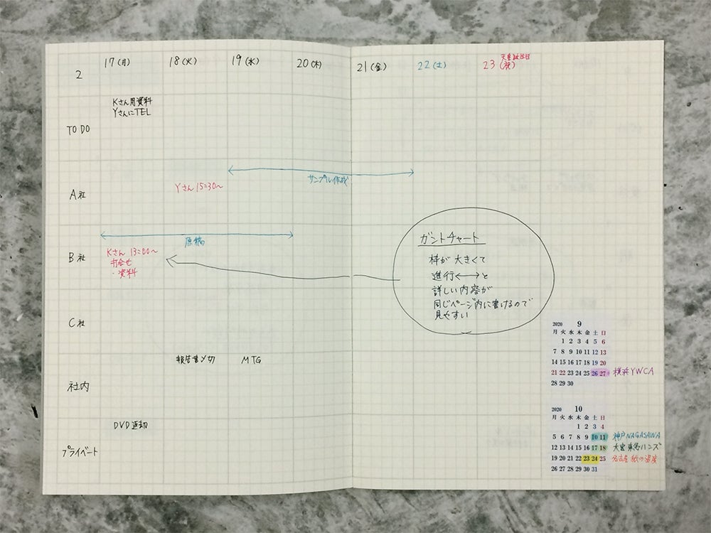 方眼ノートに薄く枠(仕切り)が入っていて自由に使えるため、スケジュール管理で縦横自在に使えます。