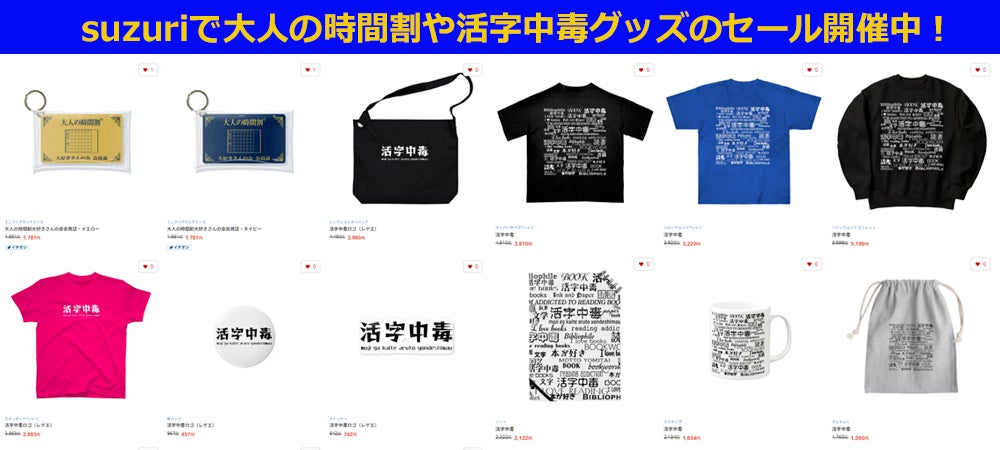 2025/04/04 12:58イベントのお知らせを送らせていただきます。1.suzuriで活字中毒や大人の時間割ファングッズ販売開始しました&セール開催中です2.新生活応援フェア4月10日(木)まで3.2025年イベント出展のお知らせ【1.suzuriで活字中毒や大人の時間割ファングッズ販売開始&セール】以前細々と始めていて、試作品を作って準備していたsuzuriが本格始動しました。お店の名前は「大人の時間割」にしました。↓https://suzuri.jp/otonajikanwari/productssuzuriというのは、自分の描いたイラストや、撮った写真などをアップロードして、それぞれの画像をTシャツとかバッグとか文具とかと組み合わせて自分のお店を作って、それを見て気に入った人が注文すると、その画像入りグッズをsuzuriが作ってお客様のもとに発送してくれるサービスです。(誰が買ったか作家にはわかりません。でも自分もsuzuriに出品していてそのアカウントから買った場合はその人が買ってくれたことがわかります)「大人の時間割 suziri店」の場合は全部のグッズに利益300円で設定しているので、1個売れたら兎原にそのうち300円が入るみたいです。大人の時間割を広める活動資金にさせていただきます。suzuriでは大きく分けて・うさぎグッズ(兎原がパソコンで描いた超貴重なグッズ。今はTシャツとバッグのみ)・文房具と手帳が大好きグッズ(I love stationery and notebooksのです。ハート付き)・カラーチャートグッズ(自分用の試作品として作ったけどかわいい上に便利なので販売)・大人の時間割大好きさんの会公式グッズ(ミニクリアマルチケースとステッカーのみ。会員証が小物入れになるという便利グッズです。これはぜひバッグなどにつけて使っていただきたいです)・活字中毒全面ロゴグッズ(今、通販での販売開始した全面ロゴです。こちらはトレーナーもあるし、スマホケースとかリングノートとか印刷色がグリーンのものとか、兎原がなかなか作れないものがたくさんです)・活字中毒シンプルロゴグッズ(こちらもビッグショルダーバッグとか帽子とか缶バッジとかあっておもしろいです)suzuriのBIGセールが始まりました! 期間は2025年04月04日(金) 12:00 ~ 2025年04月13日(日) 23:59です。割引金額についてはsuzuriの公式サイトをご覧くださいませ。↓https://suzuri.jp/media/journal_11th-bigsale/スタンダードTシャツが1,000円引きで一番安いので、買うならこの機会がおすすめです。他のTシャツなどは700円引き。あとは500円引きや100円引きのものも。買わなくてもいいのでぜひ見に来てくださいませ。あとできれば、いいねのハートマークを押していただけるとすごくうれしいです。【2.新生活応援フェア4月10日(木)まで】大人の時間割の公式通販「うさぎの便利グッズ屋」では、ただいま初めて大人の時間割帳を使われる方のお試し書き用に、3,000円(送料・手数料別)以上お買い上げの方に、大人の時間割帳1か月用(黒ごま)を1冊プレゼントしています。もちろん、リピーター様にも差し上げております。そしてこの間文ッ字フリマというイベントで活字中毒ステッカーを販売しました。活字中毒ステッカーつきのお得な大人の時間割帳セットを4月10日まで通販で販売していますので、よかったらそちらもご覧いただけますとうれしいです。https://usabenri.shop/items/66c9eee99d9d4f2c56ac122f【3.2025年イベント出展のお知らせ】今年は大阪と福岡の本のイベントを中心に、東京にも少し行きます。イベントでしか販売していないお得な大人の時間割福袋や、イベントによっては活字中毒Tシャツやバッグなども販売します。イベント出展の目的に、遠くに住んでいるご愛用者様と直接お会いしてお話しするというのもありますので、もうクラウドファンディングで今年の手帳を買ったので、新しいものは要らない方もご遠慮なく会場でお声がけいただけますとありがたいです。今決定のイベントは以下のようになっています。■ 文学フリマ東京405月11日(日)12:00~17:00東京ビックサイト南1-4ホール(東京国際展示場・東京都江東区)入場料1,000円■ スーパーコミックシティ32-35月18日(日)11:00~15:30インテックス大阪(大阪市住之江区)入場有料■ コミックシティ福岡627月6日(日)12:00~16:00マリンメッセ福岡A館(福岡市博多区)入場有料■ お出かけ文具マーケットin大阪7月19日(土)11:00~16:30OMM 2 階Fホール(大阪市中央区)入場有料■ 文学フリマ大阪139月14日(日)12:00~17:00インテックス大阪2号館(大阪市住之江区)入場無料■ 文学フリマ福岡1110月5日(日)11:00~16:00博多国際展示場&カンファレンスセンター3階入場無料お読みいただきありがとうございました。 もっと見る通販で顧客様限定、新作のTシャツとバッグのお得な先行予約販売をしています