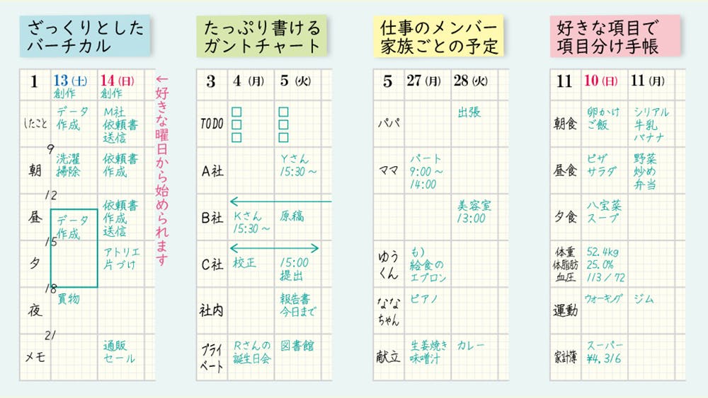 それ以外にも、勉強の計画・アイデアノート・読書ノート・家計簿・献立表・ひとこと日記、いろいろな使い方ができます。