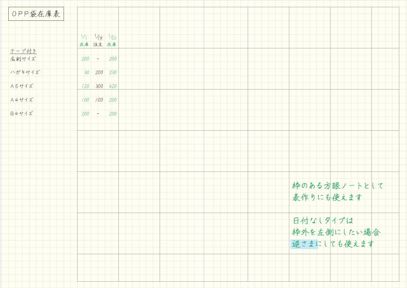 こちらは左側に方眼のフリースペースが来るようにして、在庫管理表にする使い方です。