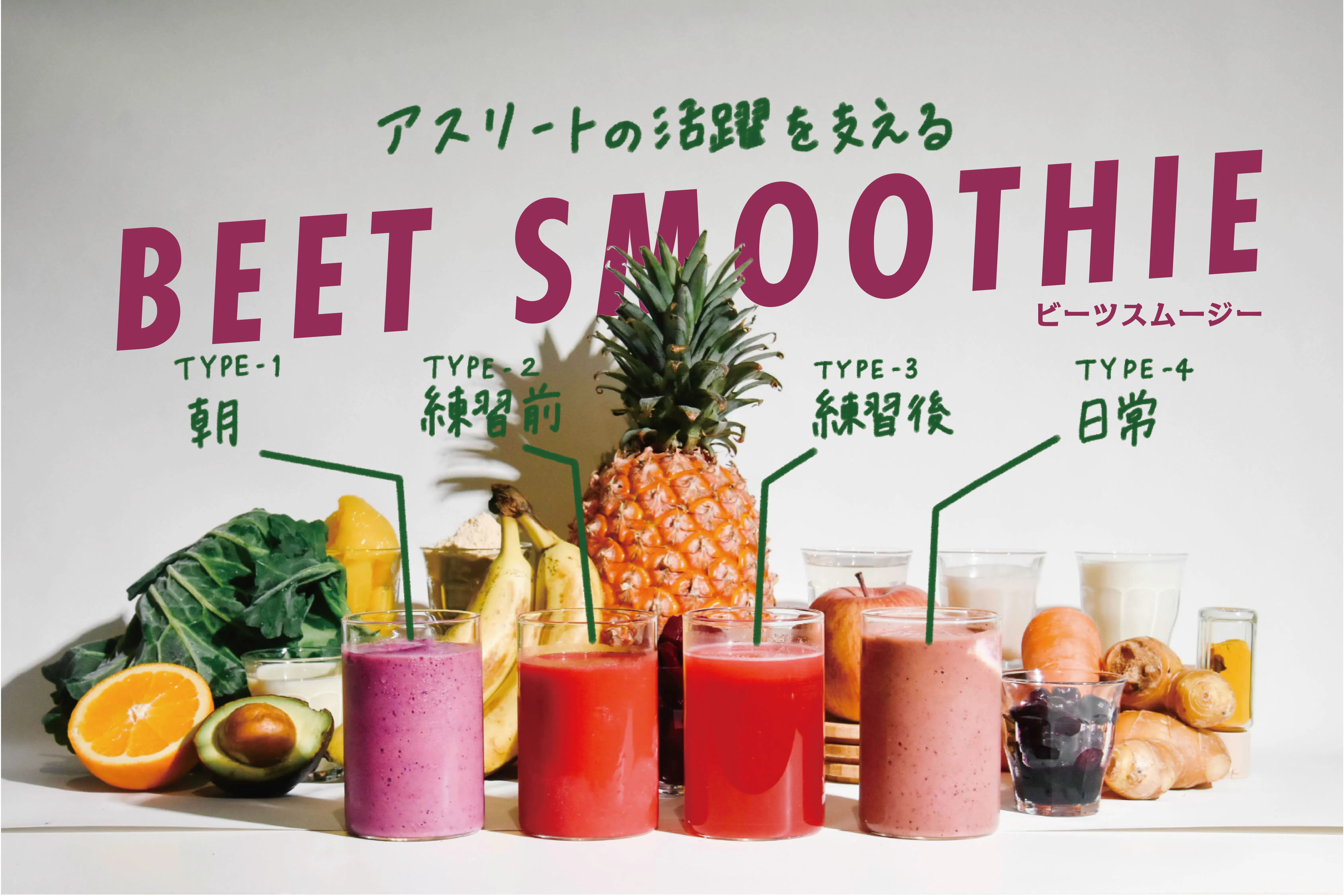 Earthy (土っぽさ)は、僕らが大好きなビーツの特徴の一つです。しかし好まない人も多くいます(最近気づきました)。そこでまずは、ビーツの美味しさを伝えるには、単体ではなく、様々な素材とMIXしたスムージーが適切なのです。
