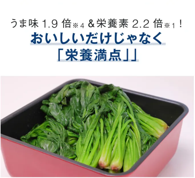 鍋で3分ゆでたものと、シカクックマルチパンで3分無水調理したものを比較結果、ほうれん草(100g)の遊離アミノ酸(18種)の通常鍋でのゆで調理では132mgに対し、シカクックマルチパンの無水調理では252mg(190.9%)試験機関:食品分析開発センター2022年11月