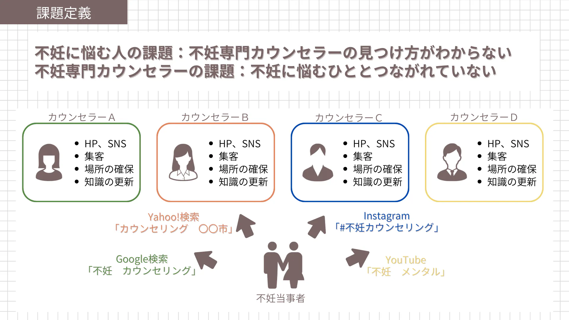 私が不妊治療をがんばっていたときは、どうやって不妊専門カウンセラーさんを見つけたらいいのかわからないことが悩みでした。ブラウザの検索エンジン、いろんなSNS、動画サイト...。どのプラットホームでどのように検索すればいいのかわからず、結局は諦めて自分の内側に閉じこもってしまう状態…しかし、不妊ピア・カウンセラーとして独立し、新たに気づいた課題があります。それは、