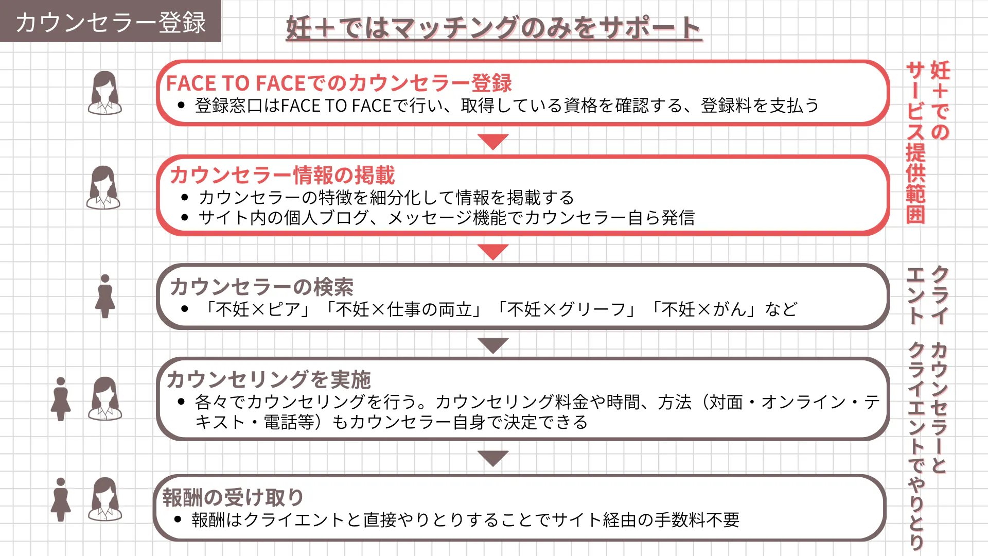 ・セミナー講師やサイト内イベントへの参加また、面談を行ったうえでカウンセラーさんを登録し、不妊に悩むひとが安心してカウンセラーさんとマッチングできるサービスを実現します。