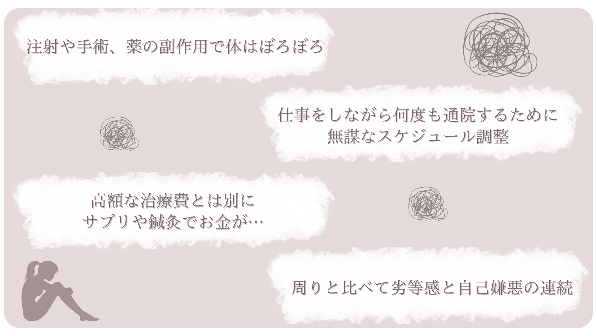 だからといって第三者のカウンセリングを受ける選択肢もなく、ただひとりで耐えてひとりで奮い立たせて、なんとか治療をつづけていたのです。 なぜ、カウンセリングのような第三者へ助けをもとめられなかったのか?