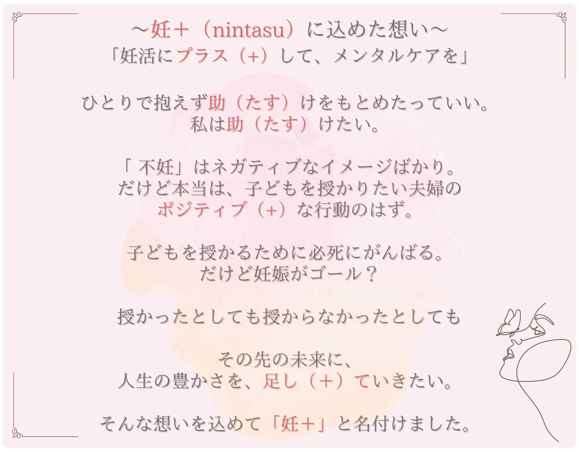 妊+は「妊活にプラス(+)して、気軽にメンタルケアを受けられる場所」をつくります。