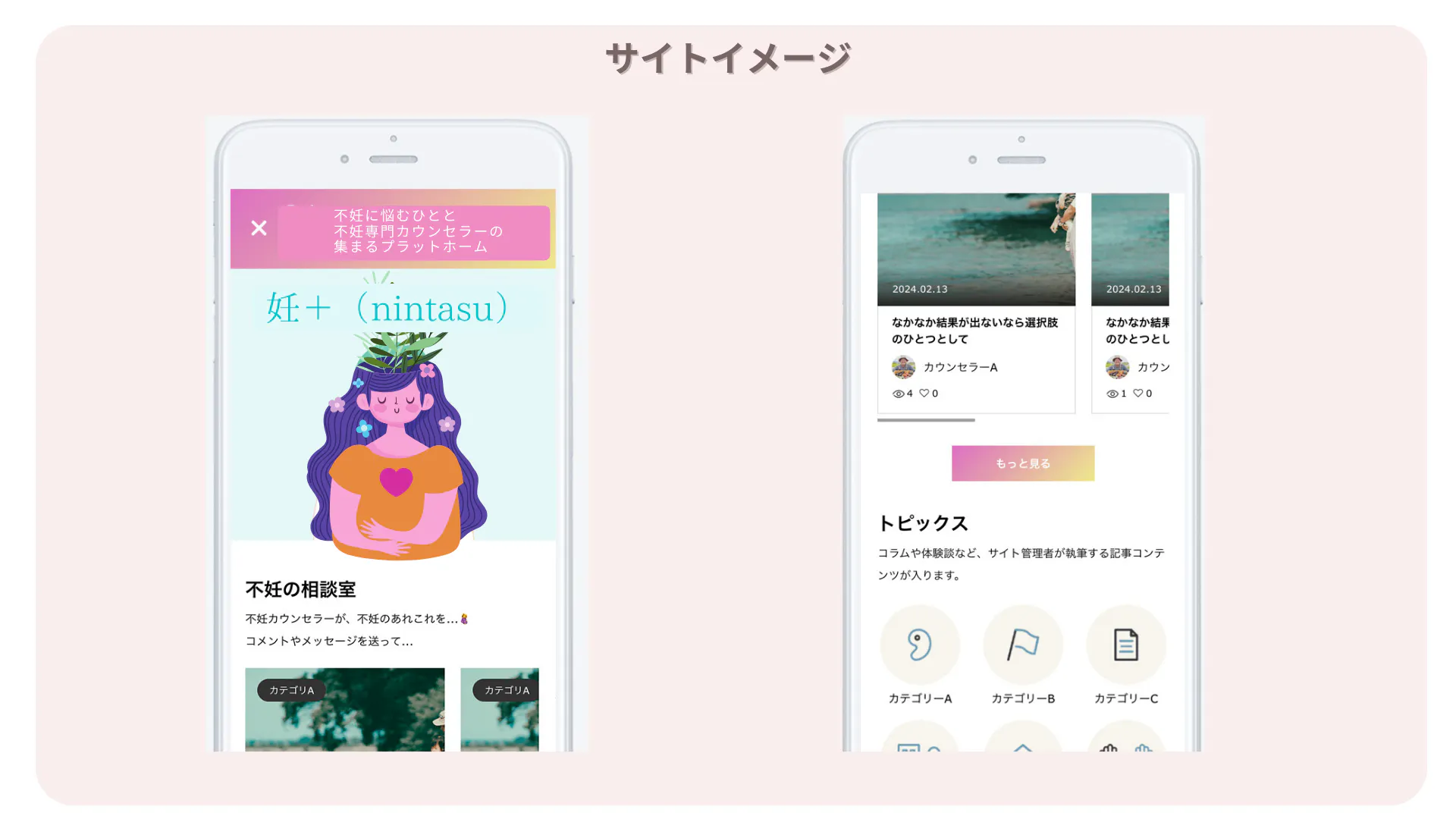 ①メンタルケアの場 「妊+(nintasu)」では不妊専門のカウンセラーさんを登録します。カウンセラーさんの情報を細かく分類して不妊に悩むひとが自分に合ったカウンセラーさんを探しやすくします。