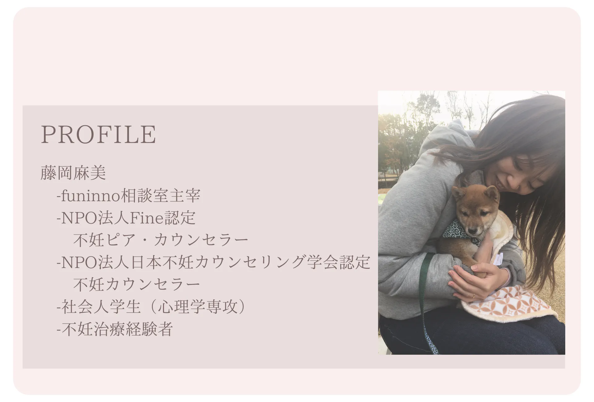 不妊ピア・カウンセラーの藤岡麻美です。夫婦2人と豆柴1匹で、広島県福山市の築約150年の古民家を手入れしながら暮らしつつ、不妊の悩みに寄り添う「funinno相談室」を主宰しています。