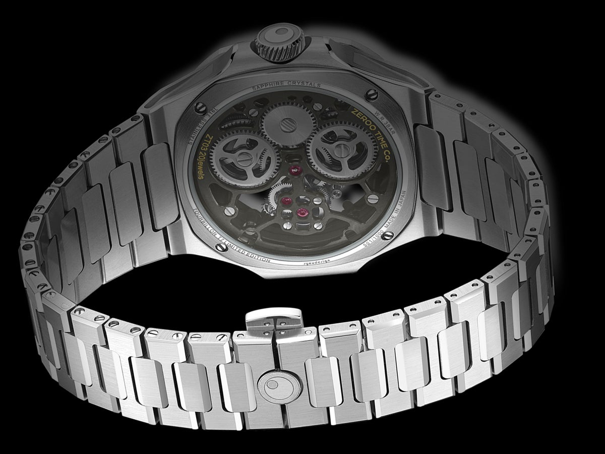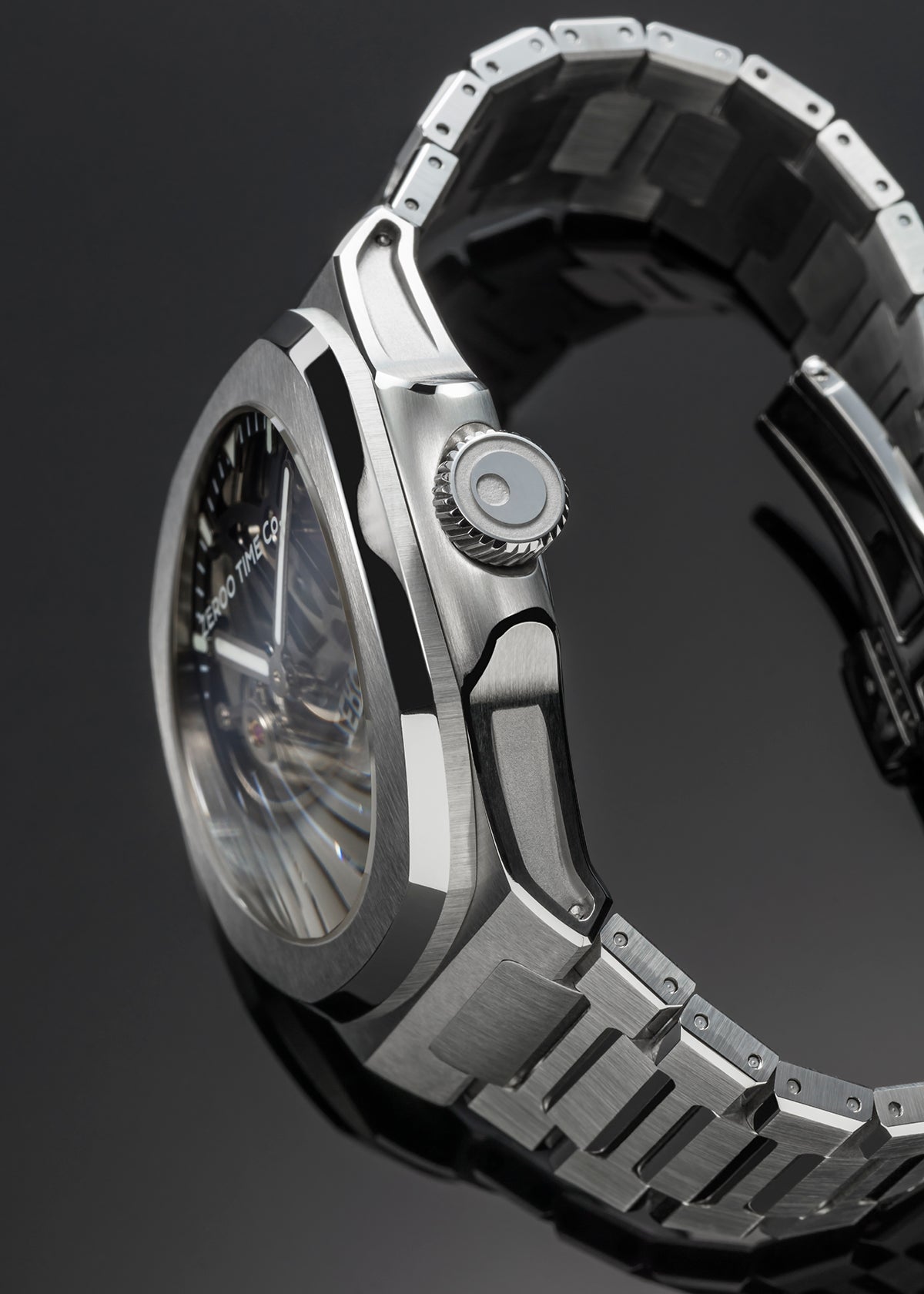 ZEROO T7は、硬質で堅牢なケースに最新デザインのトゥールビヨンムーブメントを格納したい、という思いから設計がスタートしました。ステンレスブレスもゼロからデザインを起こし、T7のために全てを新しく作り直しました。