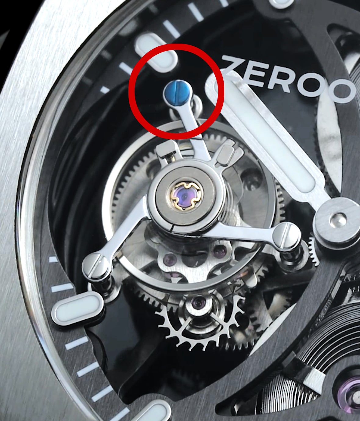 キャリッジを固定する三点のネジのひとつをブルーに着色しています。キャリッジは一分間で一回転しますので、このブルーポイントは秒針として機能します。