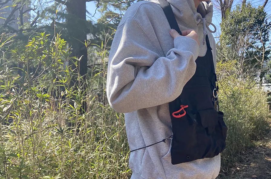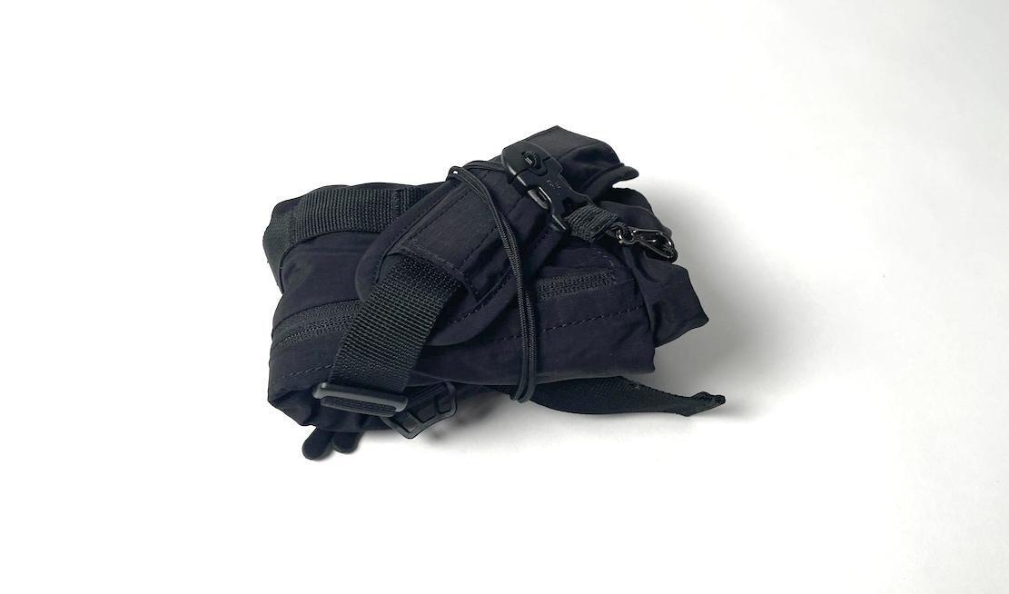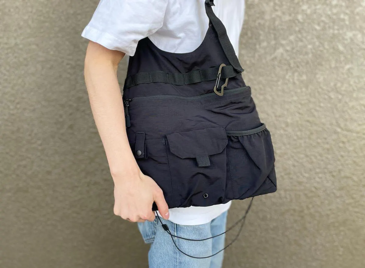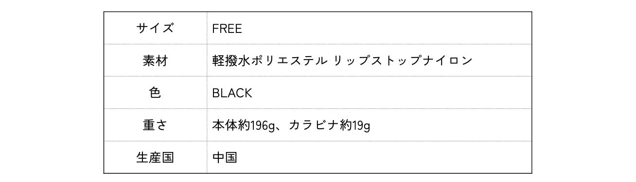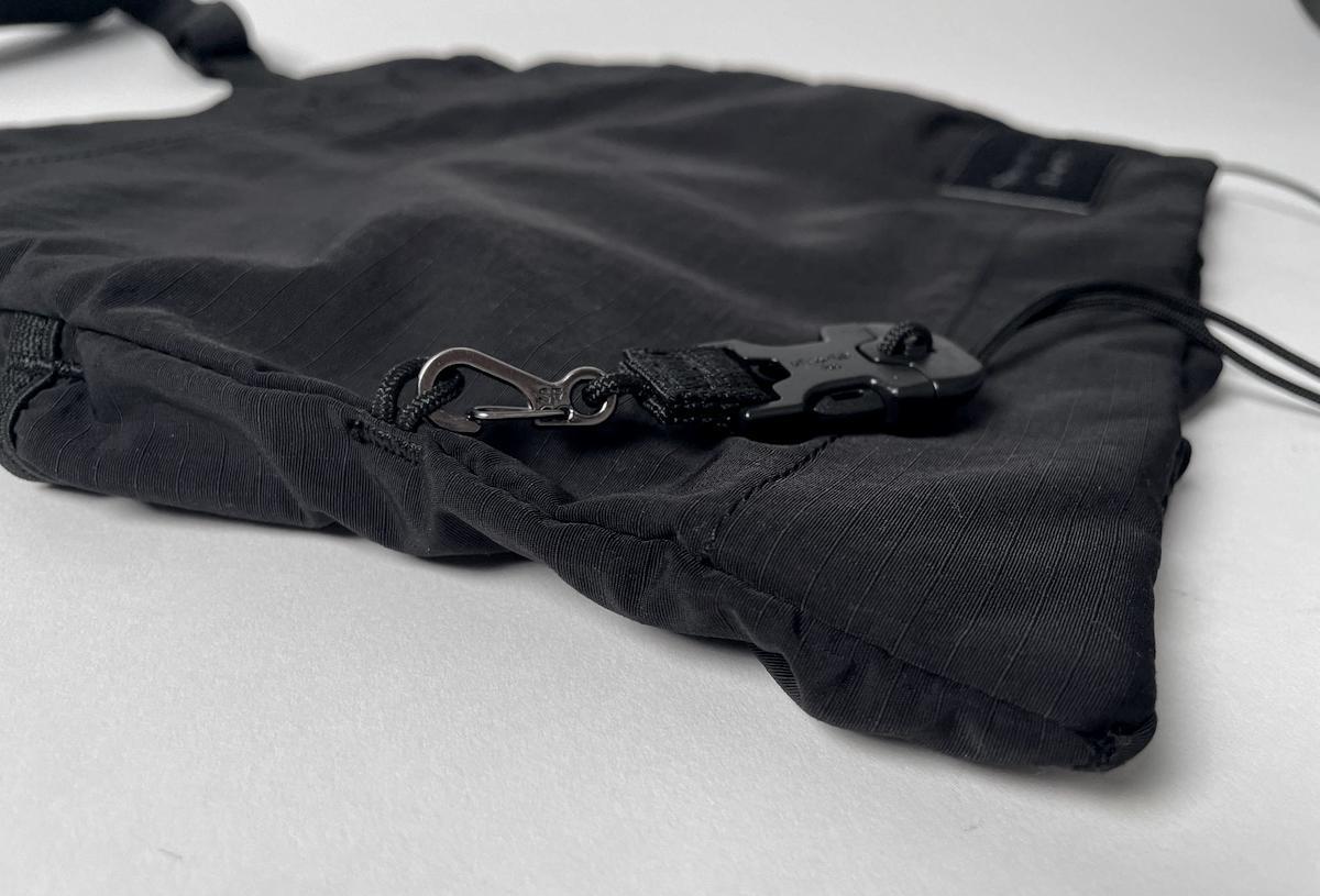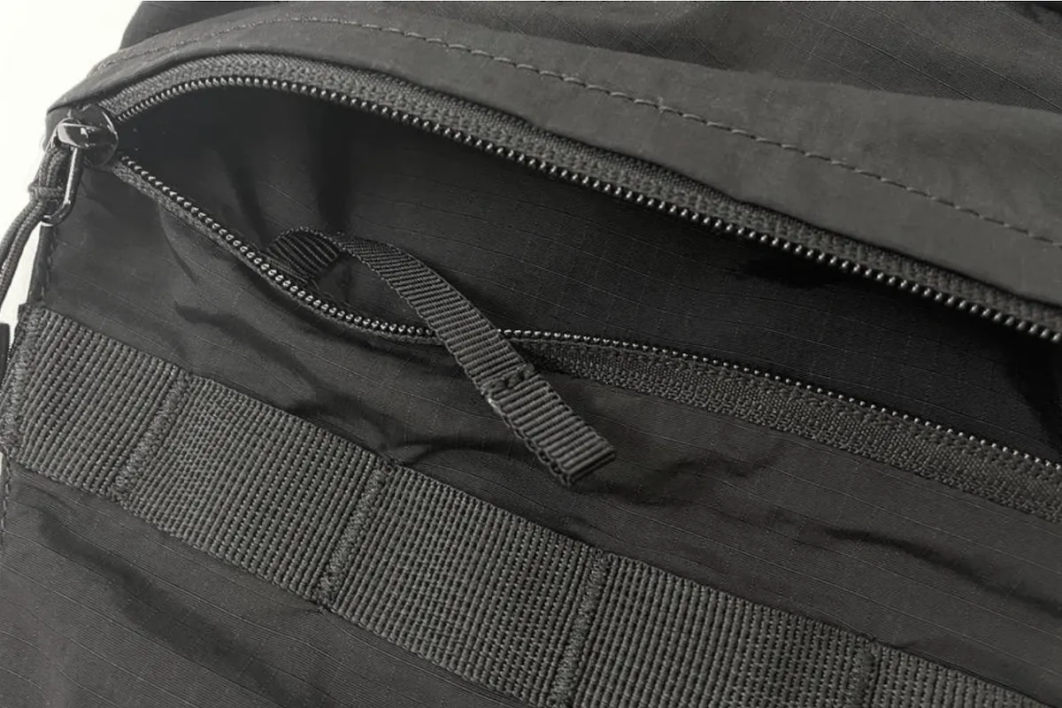 どんなコーディネートにも合わせやすい、リップストップナイロン地のブラックカラーを採用。ミニマルなデザインだからこそ、普段着に合わせても違和感がありません。
