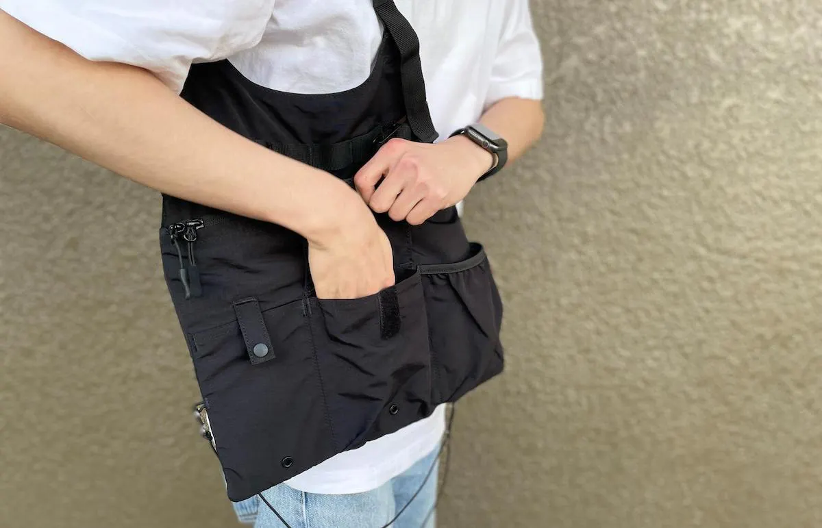 首からサッとかけられる前掛けスタイルで、着脱がスムーズなのもこのベストの魅力。しっかりと装着したい場合は取り外し可能な腰ストラップで固定すれば、風に吹かれてもパタパタとなびくことがありません。