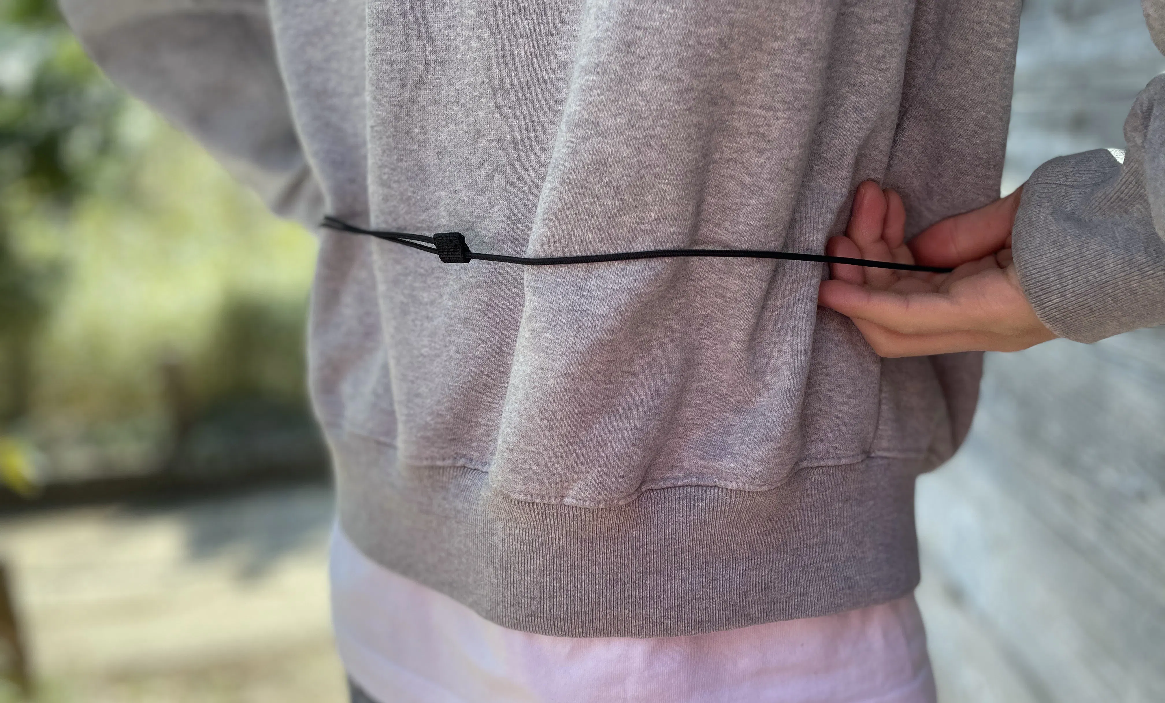 腰ストラップは、男性が分厚めのトップスを着た上からでも余裕があるくらいの長さがあり、安心。