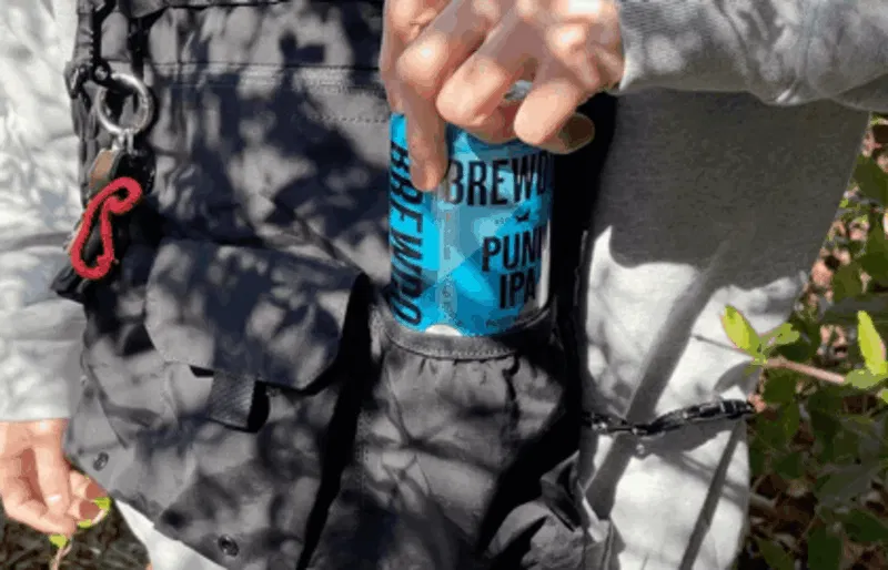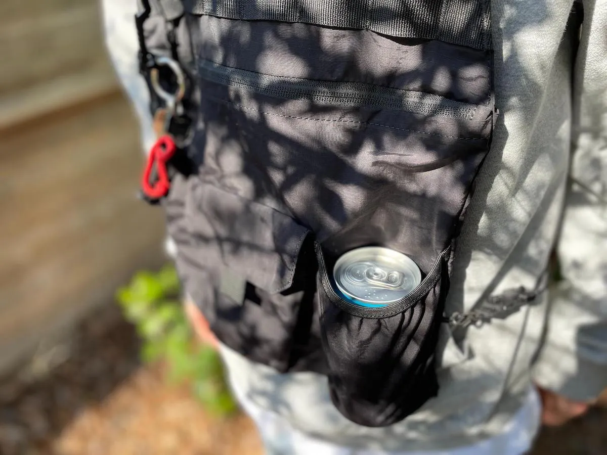 前面の左ポケットは、ちょうど350ml缶がすっぽりと入る深さと大きさ。アウトドアシーンで飲みかけのビール缶の置き場に困ったことって誰もが経験あると思います。