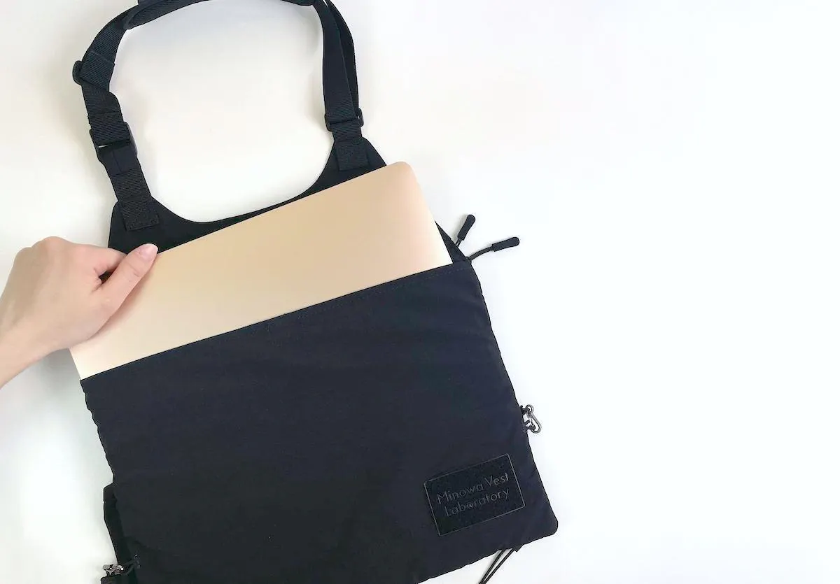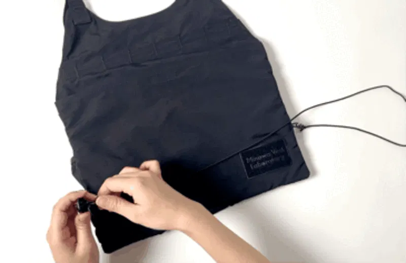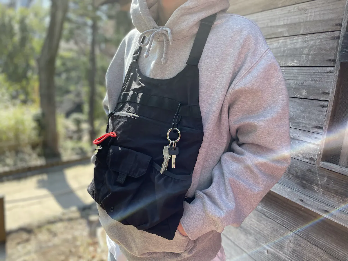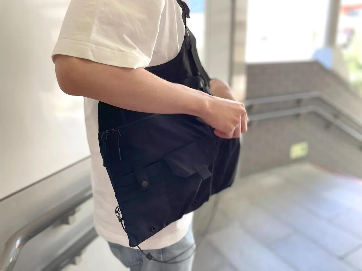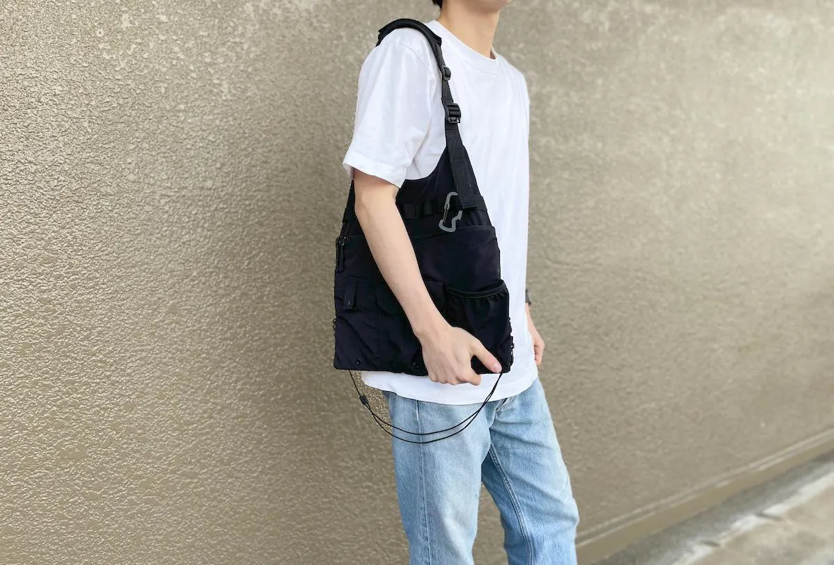 肩掛けでバッグのように持てば、ベストのデザイン自体がミニマルですっきりとしているため、普段着にも違和感なく馴染みます。