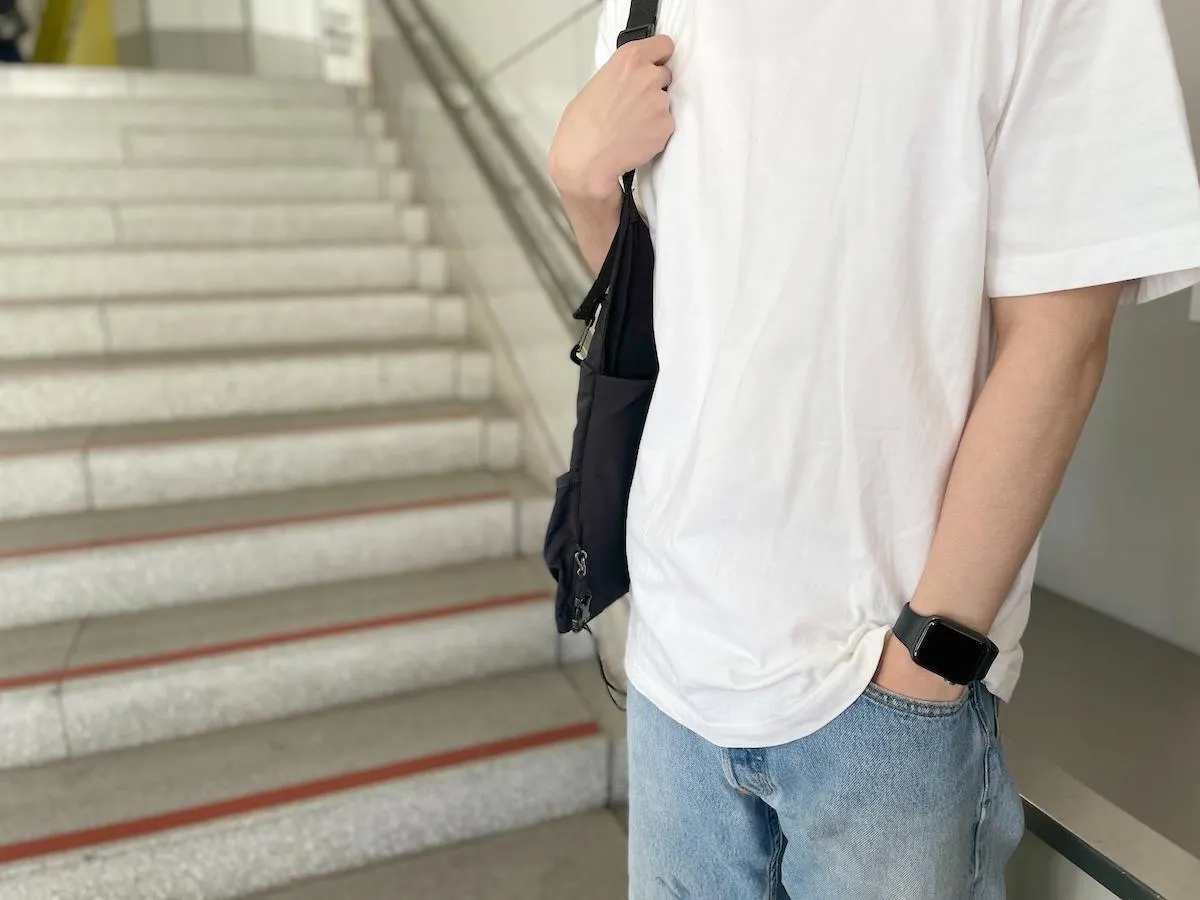 それでいて軽やか。スマートウォッチとの相性もバツグン。ブラックだから、どんなコーディネートでも合わせやすいです。