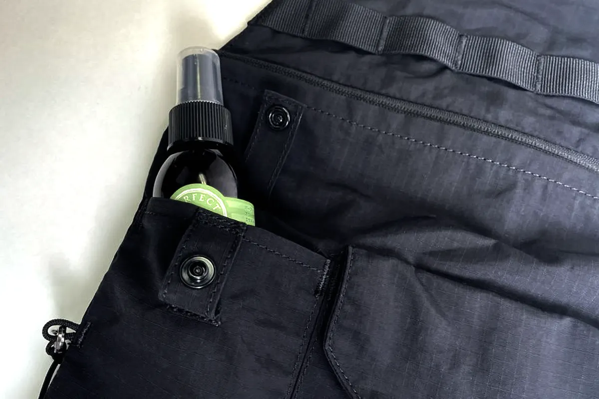 虫除けや日焼け止めなどの細長いものを入れておくのも便利。アウトドアシーンで都度使いたい小物も、親指ひとつでさっと取り出すことができます。