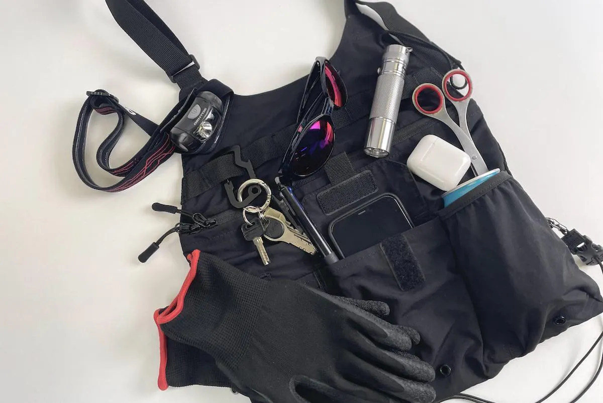 ヘッドライト、ハンドライト、サングラス、キーチェーン、ハサミ、ワイヤレスイヤホン、缶ビール、軍手……と、これらをすべて収納しても、ごちゃごちゃと持っている印象を与えません。