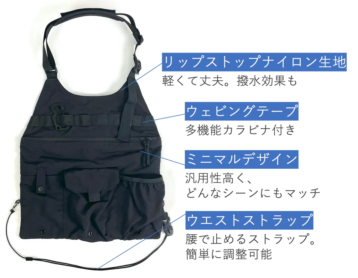 収納力があるにもかかわらず、とにかく軽くて薄い!前掛けスタイルでも邪魔になりません。