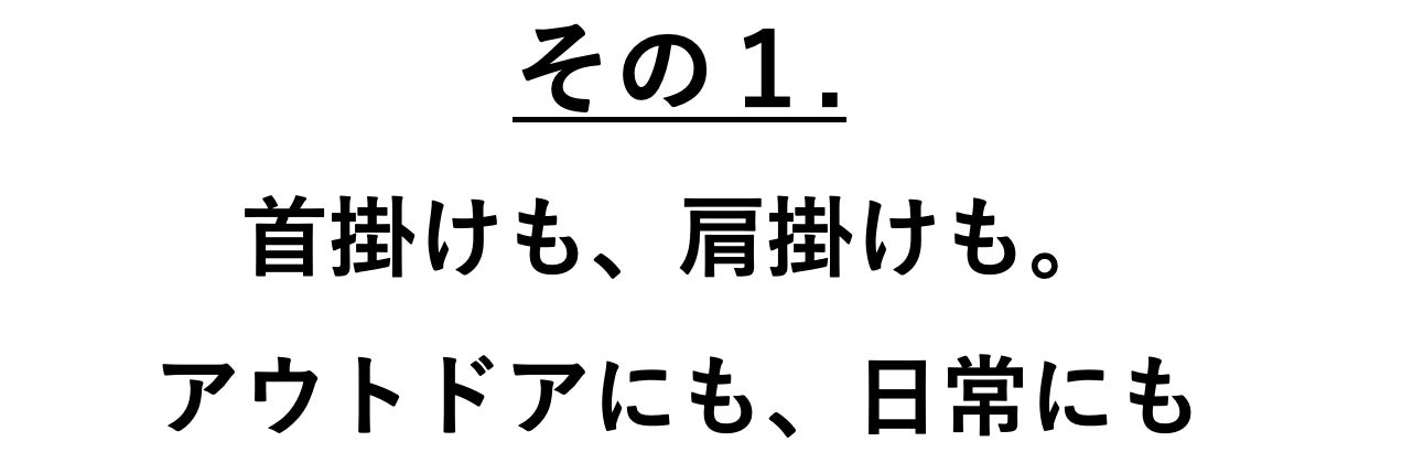 首掛けはもちろん、肩掛けスタイルでも持つことができ、アウトドアだけでなく、日常にも活用できる汎用性の高さです。裏面下部のコードは、腰に巻き付けられるストラップ。フィットする長さに簡単に調整可能です。