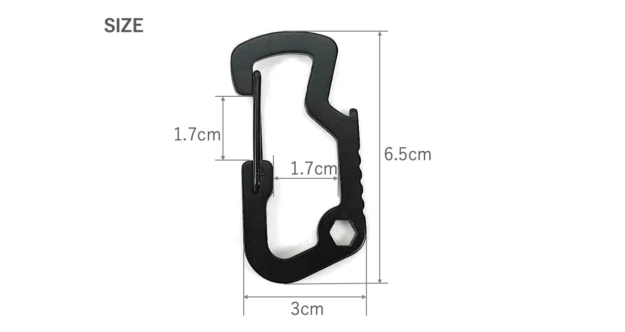 購入時は、こちらの「マルチツールカラビナ」が一つ付属します。カラビナとしての役割はもちろん、何役もこなしてくれるスグレモノ。