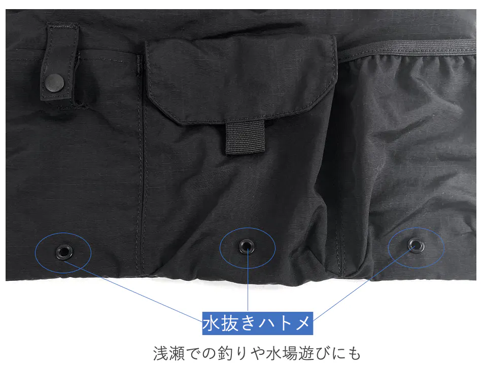 フロント下部の3つのポケットには水抜き付き。浅瀬での釣りや子供と一緒にじゃぶじゃぶ池で遊ぶシーンなど、水に少し浸かってしまってもすっと水抜きができます。