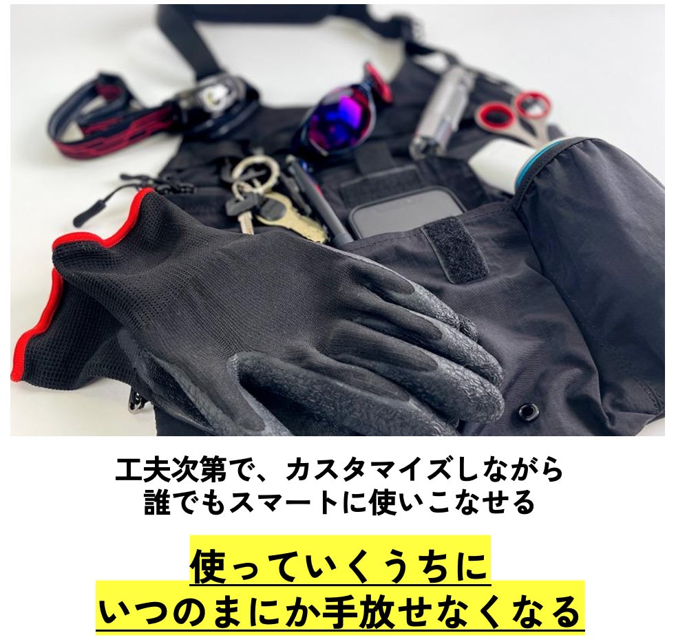 チャッカマン、ライト、折り畳みナイフ……。自分の一番使いやすい仕様にベストをカスタマイズしていくのは楽しいですよね。
