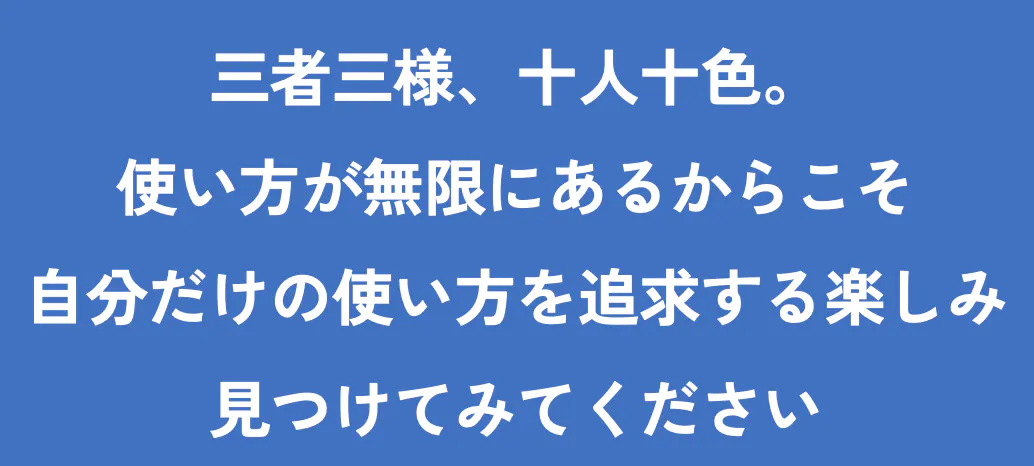 三者三様、十人十色。使い方が無限にあるからこそ、自分だけの使い方を追求する楽しみ、ありそうです。