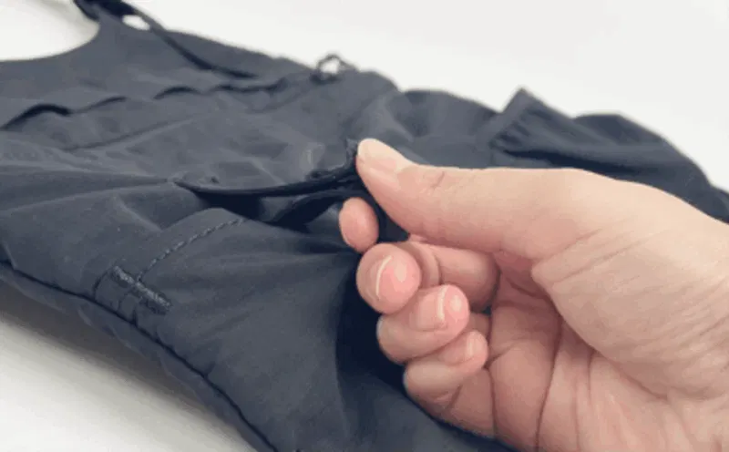 軽い素材のため、アウトドアシーンでは風が強い日などはパタパタとなびく心配も。そんなときは、腰ストラップをまわして簡単に固定できます。