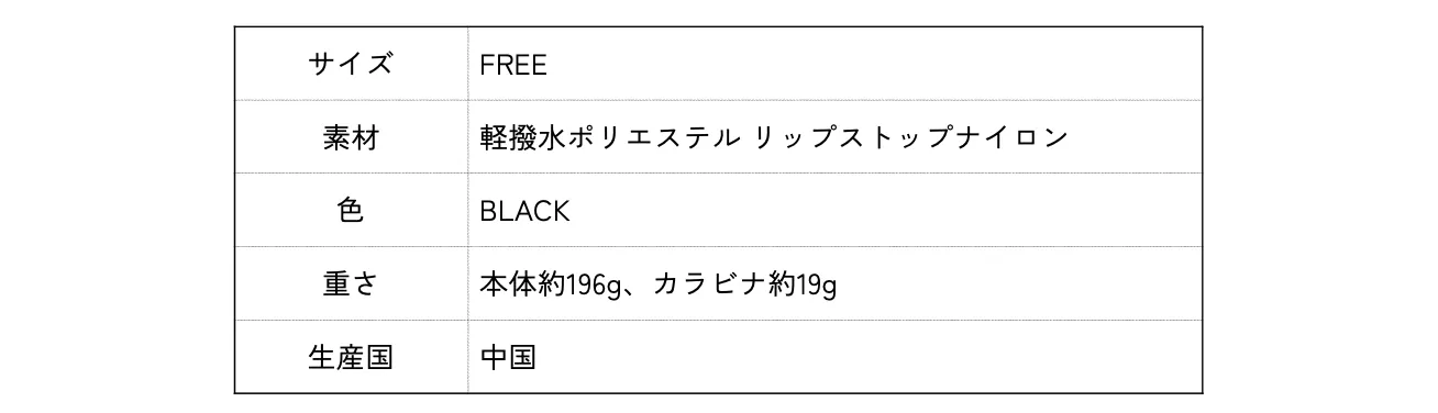 バッグ自体が軽いのは、アウトドアシーンではマスト。重量は約196g(付属のカラビナを除く)と軽量の上、汚れたり破れたりしやすいアウトドアシーンでも、耐久性のある丈夫な生地が採用されています。