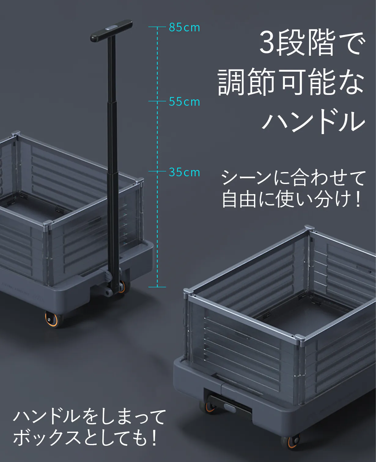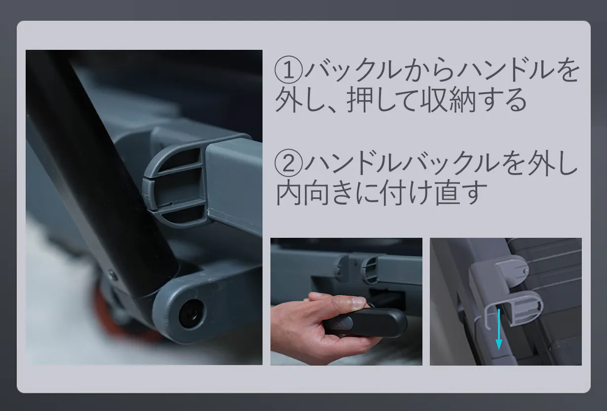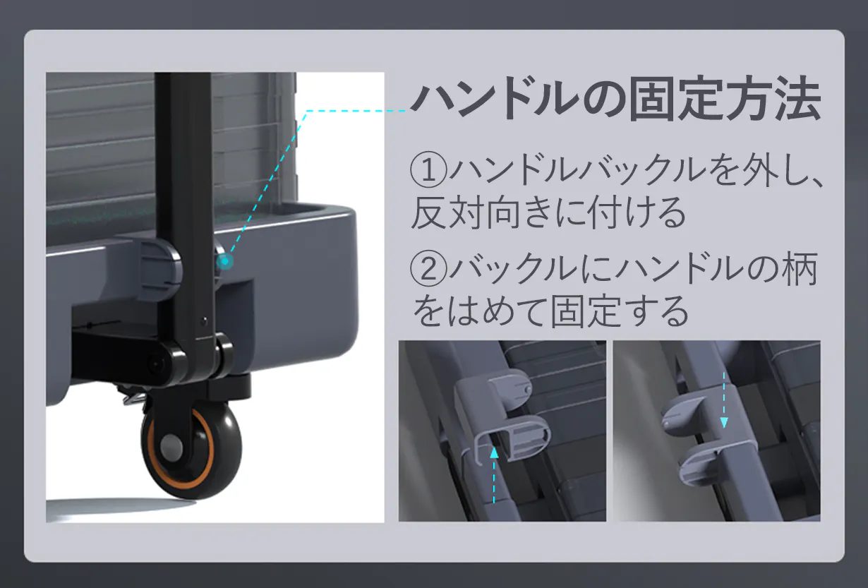 動かさない時は車輪をロックしてハンドルをしまえば箱状になるので更にコンパクトに!