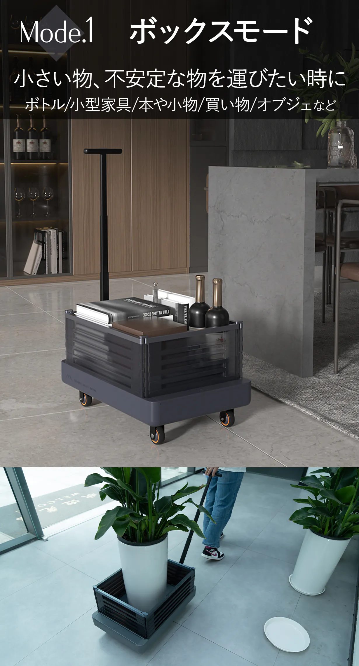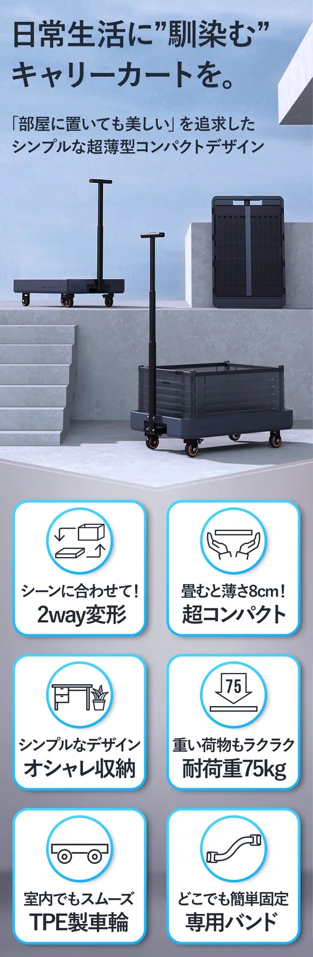 お部屋やオフィスの景観を崩さずにいつでもどこでも使える日常用キャリーカートです。