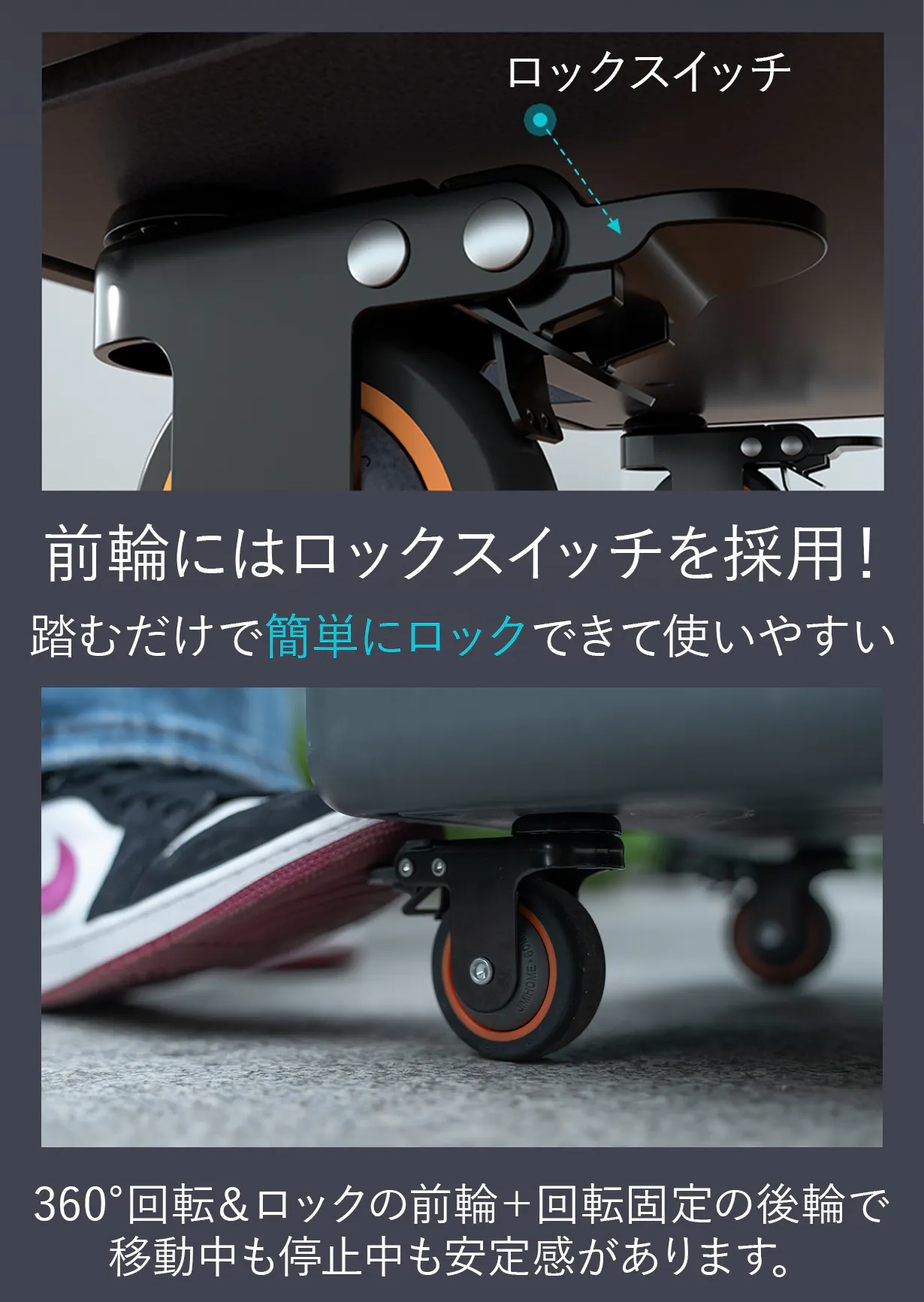 屋外やオフィスの廊下だけじゃなく、室内でも使いやすいように柔軟性のあるTPEゴム製の車輪を採用しました!