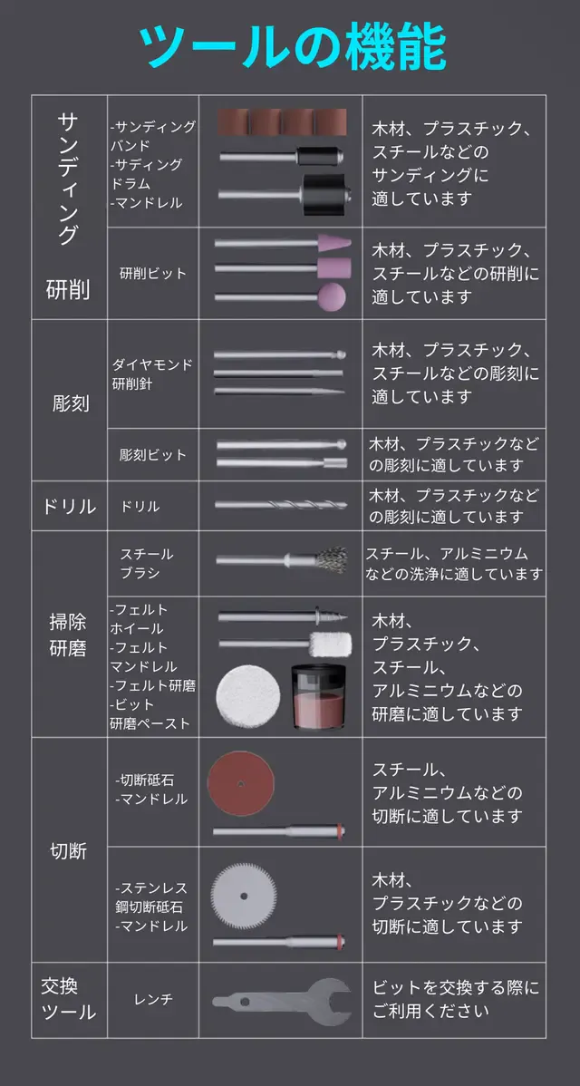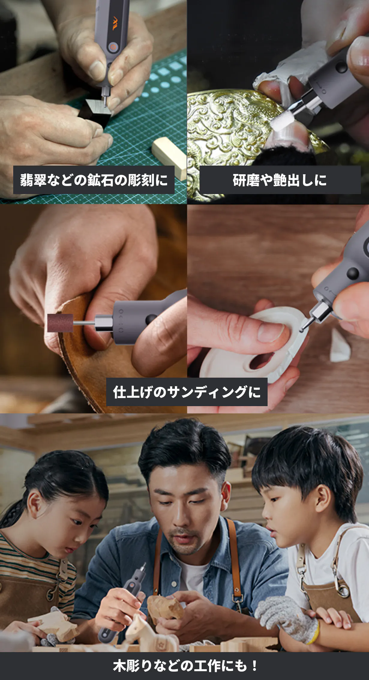 30個の便利なツールがコンパクトで軽量なケースに収められ、彫刻、穴あけ、サンディングなどの作業を外出先でも簡単に行えます。