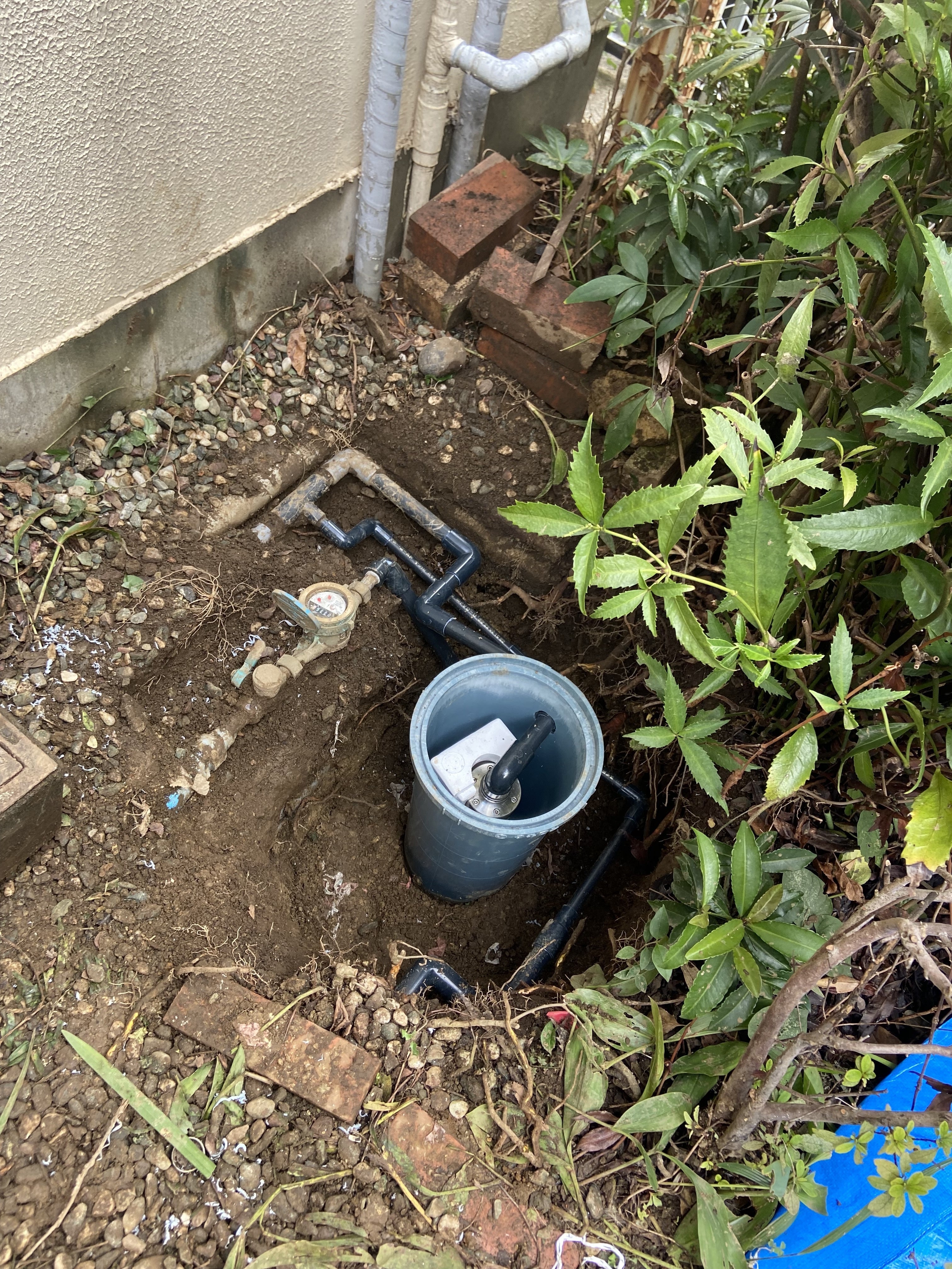 このように水道メーター脇を掘って、枡の中に垂直に立てて水道配管を接続します。保温処理して蓋を閉めます。