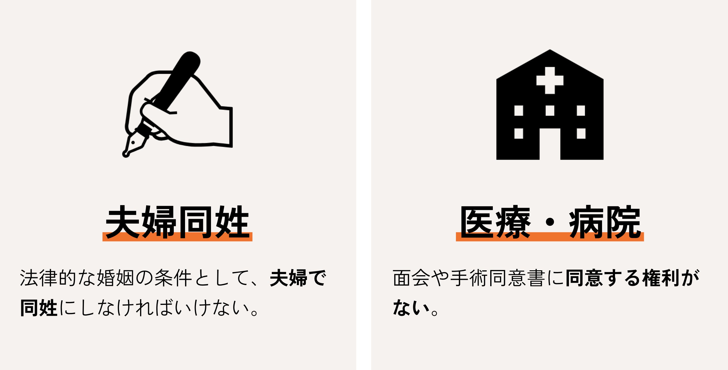 同性カップルや夫婦別姓を貫きたい事実婚カップルなど家族形態が多様化する一方で、かぞくが安心して、みらいに夢を見るためのセーフティネットである社会制度が追い付いていない現状があります(一部企業・病院・自治体では例外あり) 。その他にも、国民健康保険が同一世帯者として認められなかったり、生命保険の受取人として登録できなかったりなど、事実婚の状態では、様々な社会制度上のハードルがあります。