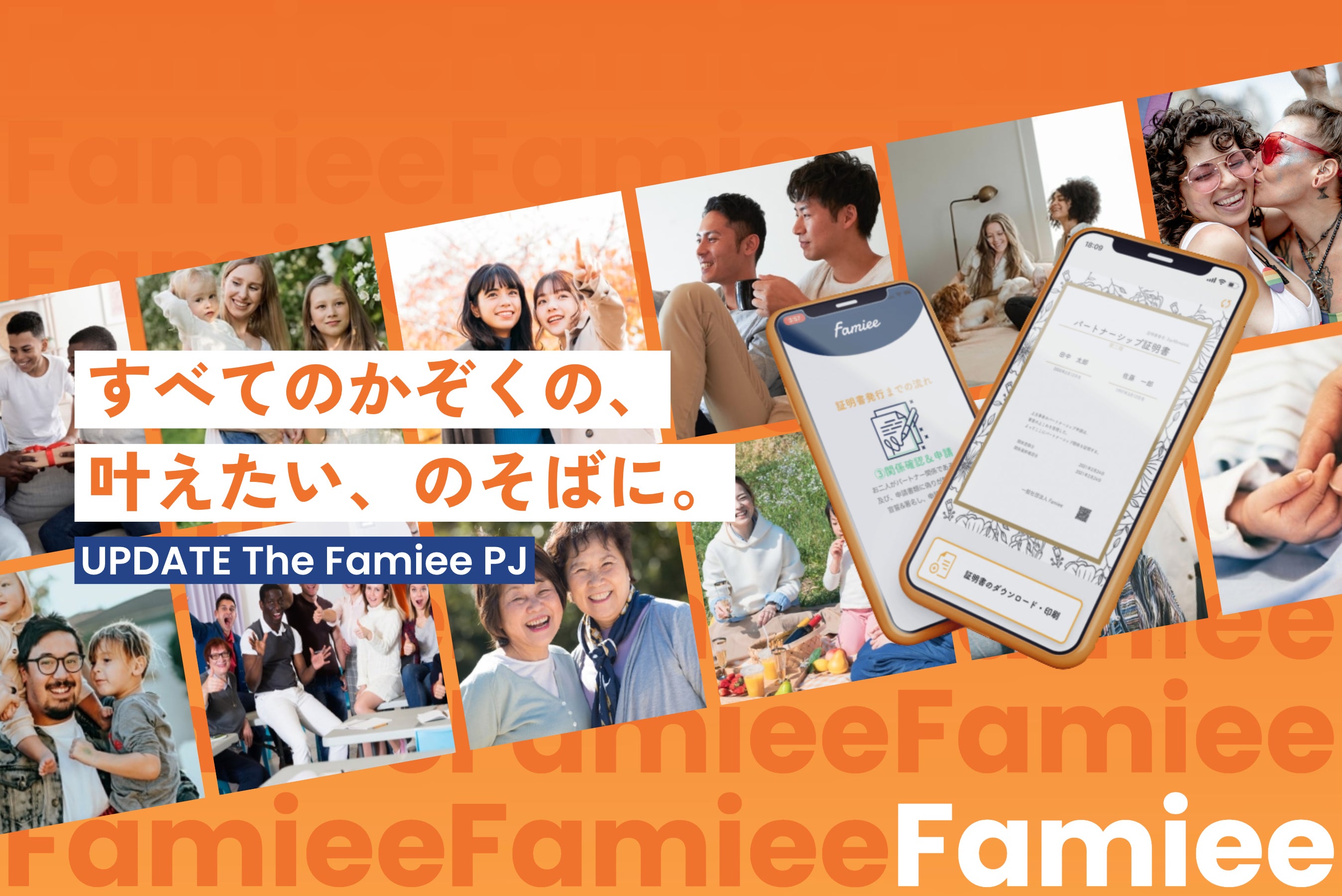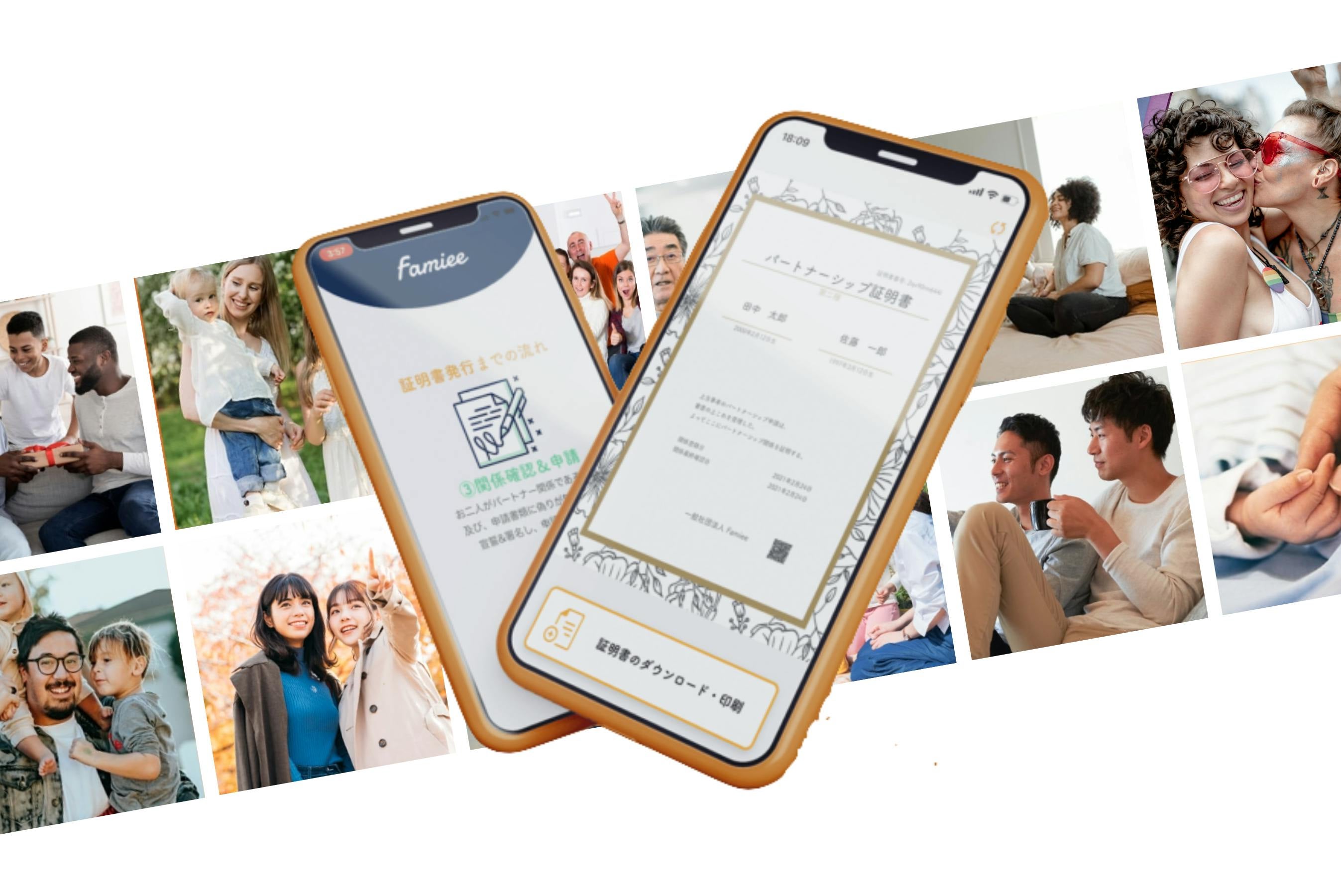 「Famiee」とは多様化する家族形態に対し、アプリでの申請のみで発行でき、ブロックチェーン技術で高い安全性も担保された「民間発行のパートナー証明書」により、生きていく上で様々な社会制度上のハードルのある同性・事実婚カップルが、法律婚に基づく家族と同等の権利や家族向けサービスを受けられることを目指すサービスです。