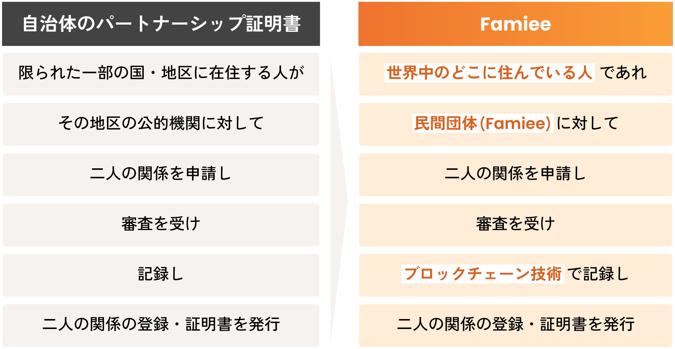 自治体が発行する住んでいる場所や利用できる人に一定の制約のあったパートナーシップ証明書から、世界中、どこに住んでいるかぞくでも申請・利用できる民間発行のパートナーシップ証明書をブロックチェーンの技術で実現しました。