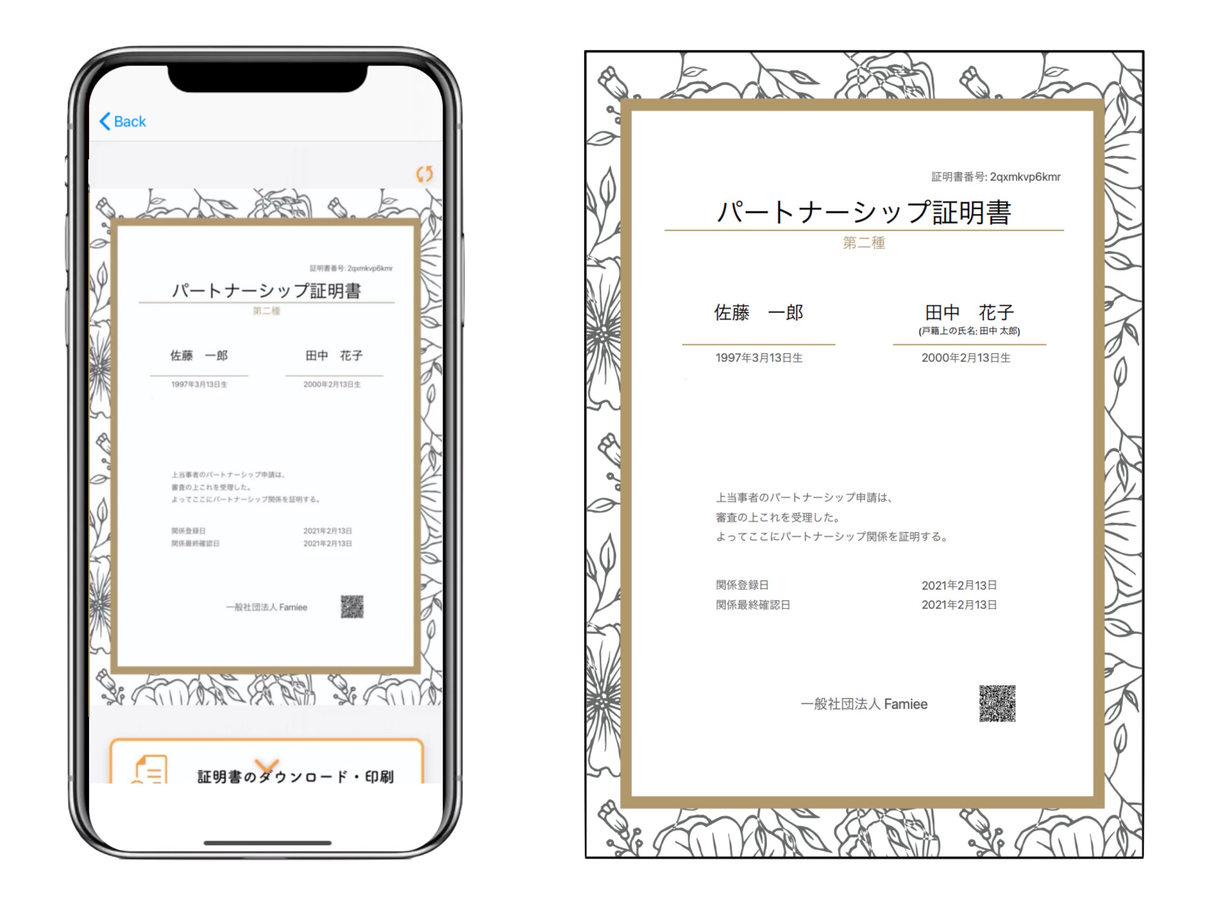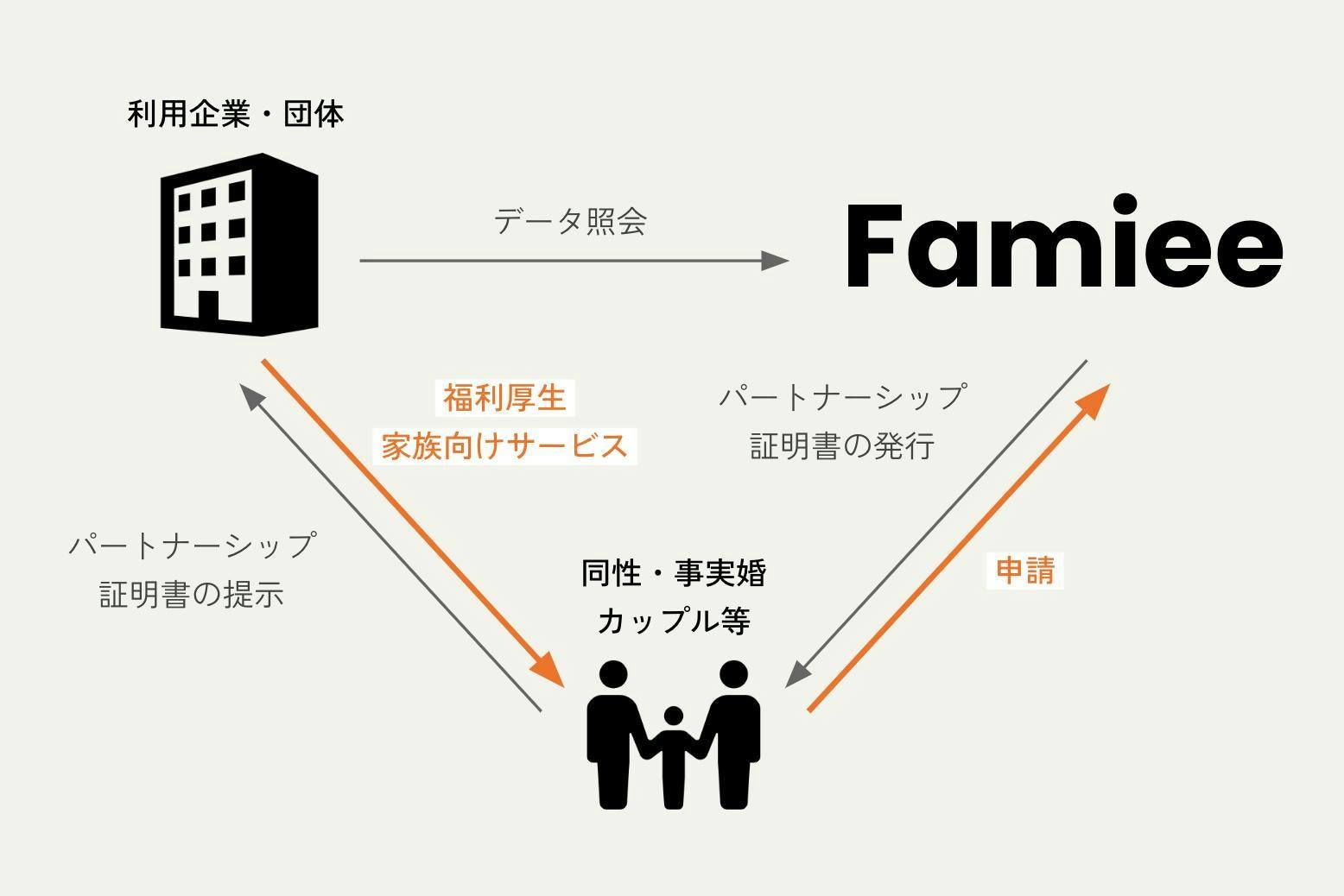 「Famiee」はパートナー同士でスマートフォンでパートナーシップ証明書を申請し、本人確認や審査を経て、パートナーシップ証明書が発行され、その証明書を「Famiee」が提携する利用企業・病院・自治体に提示することで、法律婚に基づく家族と同等の福利厚生や家族向けサービスを受けることができる仕組みです。