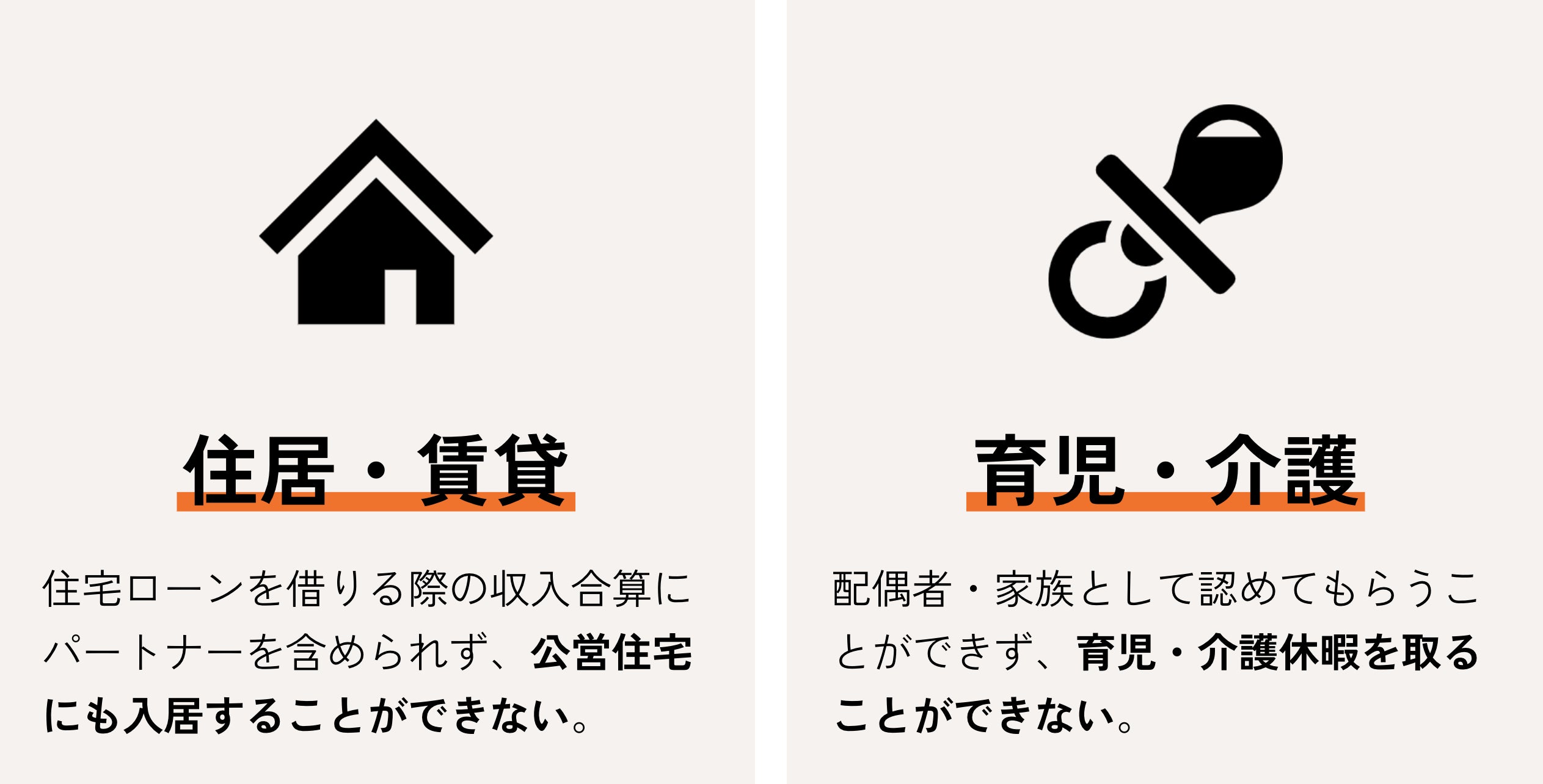 自治体発行のパートナーシップ証明書は、市区町村在住者であることが前提で、他の市区町村に転居しづらかったり、二人で役所に出向く際に関係性がオープンになる危険性があったり、行政毎に発行要件が異なるなど、まだまだ課題解決の道半ばの状態です。