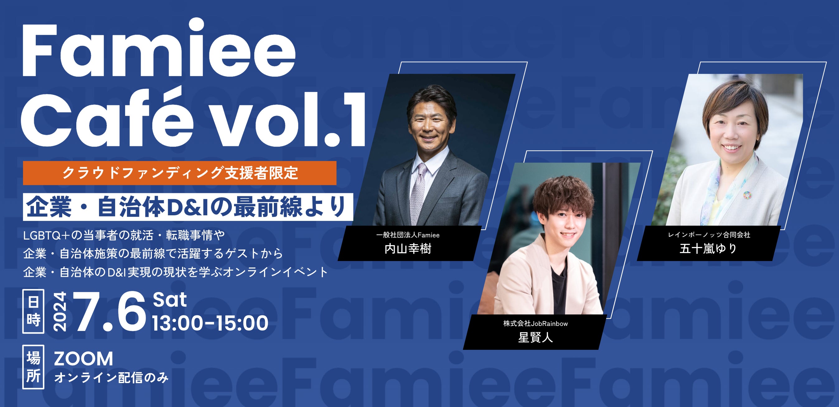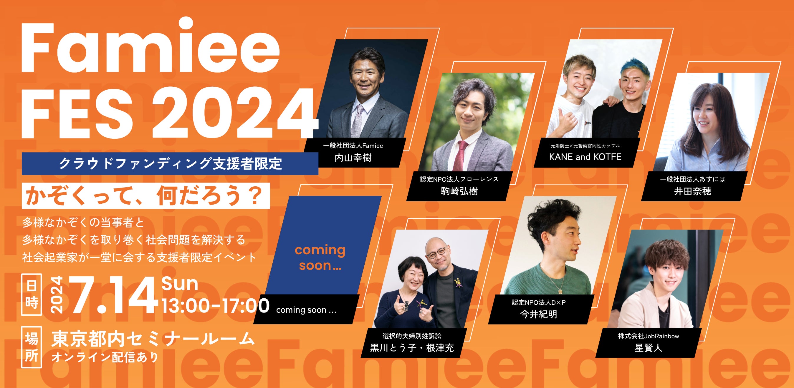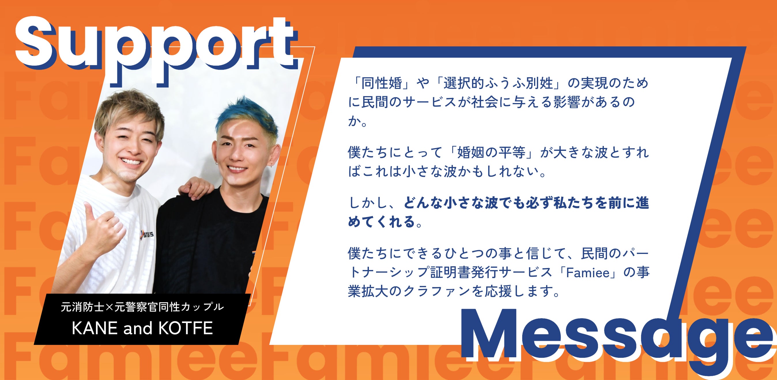 2024/07/18 13:35皆さま、こんにちは!Famieeの内山穂南です!CAMPFIREでのご報告が大変遅くなってしまいましたが、5月19日をもちまして無事にFamiee初のクラウドファンディングの挑戦が終了いたしました。最終支援総額は10,765,006円と目標金額を上回り162名の方にご支援いただきました。ご支援・ご拡散いただいた皆さま本当にありがとうございました。皆さまからの支援コメントを拝見し、長年Famieeを支えてくださる皆さまやこのクラウドファンディングをきっかけにFamieeを知っていただいた方も多く、とても嬉しい限りです。そして、先日7月14日に今回のクラウドファンディングの支援リターンの1つである「Famiee FES&報告会」をLIFULL HUBにて開催いたしました。まずは弊社代表・内山幸樹より、改めて民間型パートナーシップ証明書「Famiee」のサービスのご紹介と、今回皆さまよりご支援・協賛いただいたプロジェクトの進捗状況と今後の展望について、ご説明させていただきました。その後は、豪華なゲストの皆さまにお越しいただきパネルディスカッションを開催。一つ目のセッションは「わたしたちの、かぞくのかたち」と題して、元消防士×元警察官同性カップルのKANE&KOTFEさんと、選択的夫婦別姓訴訟・原告の黒川とう子さん、根津充さんにご登壇いただきました。二つ目は「LGBTQ+/選択的夫婦別姓の課題解決の現場から」と題して、株式会社Job Rainbowの星賢人さん、一般社団法人あすにはの井田奈穂さんにご登壇いただきました。最後は「社会をルールから変革する社会起業家」と題して、認定NPO法人フローレンスの駒崎弘樹さん、そしてリモート出演にて認定NPO法人D×Pの今井紀明さんにご登壇いただきました。ゲストの皆さまをはじめ、ご来場いただいた皆さま・オンラインにてご視聴いただいた皆さま、誠にありがとうございました。どのセッションもかなり素敵なお話が盛り沢山でしたので、今回ご支援いただいた皆さまにも是非ご覧いただきたく、後日期間限定にてアーカイブ配信をできればと思っております。準備が整いましたら改めてご連絡させていただきます。Famieeの今回の挑戦はあくまでも一歩目であり、ここがゴールではありません。改めてFamieeのミッションである「多様な家族のカタチが認められる社会の実現」に向けて走り続けたいと思います。引き続き変わらぬご支援ご鞭撻のほど、どうぞよろしくお願いいたします! もっと見る