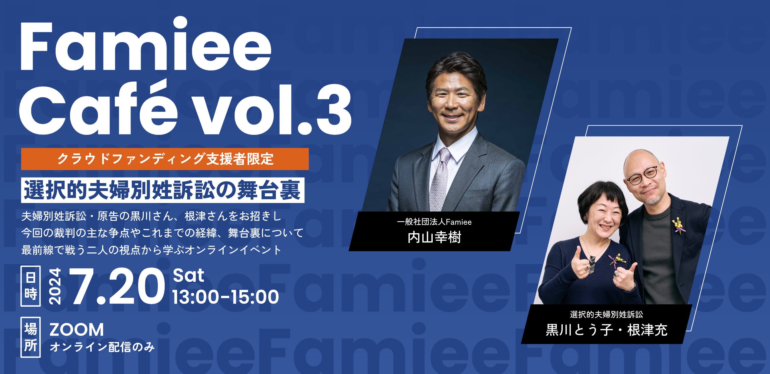三度目となる夫婦別姓訴訟・原告の黒川とう子さん、根津充さんをお招きし、今回の裁判の主な争点やこれまでの経緯、舞台裏について、最前線で戦う二人の視点から学ぶオンラインイベントです。