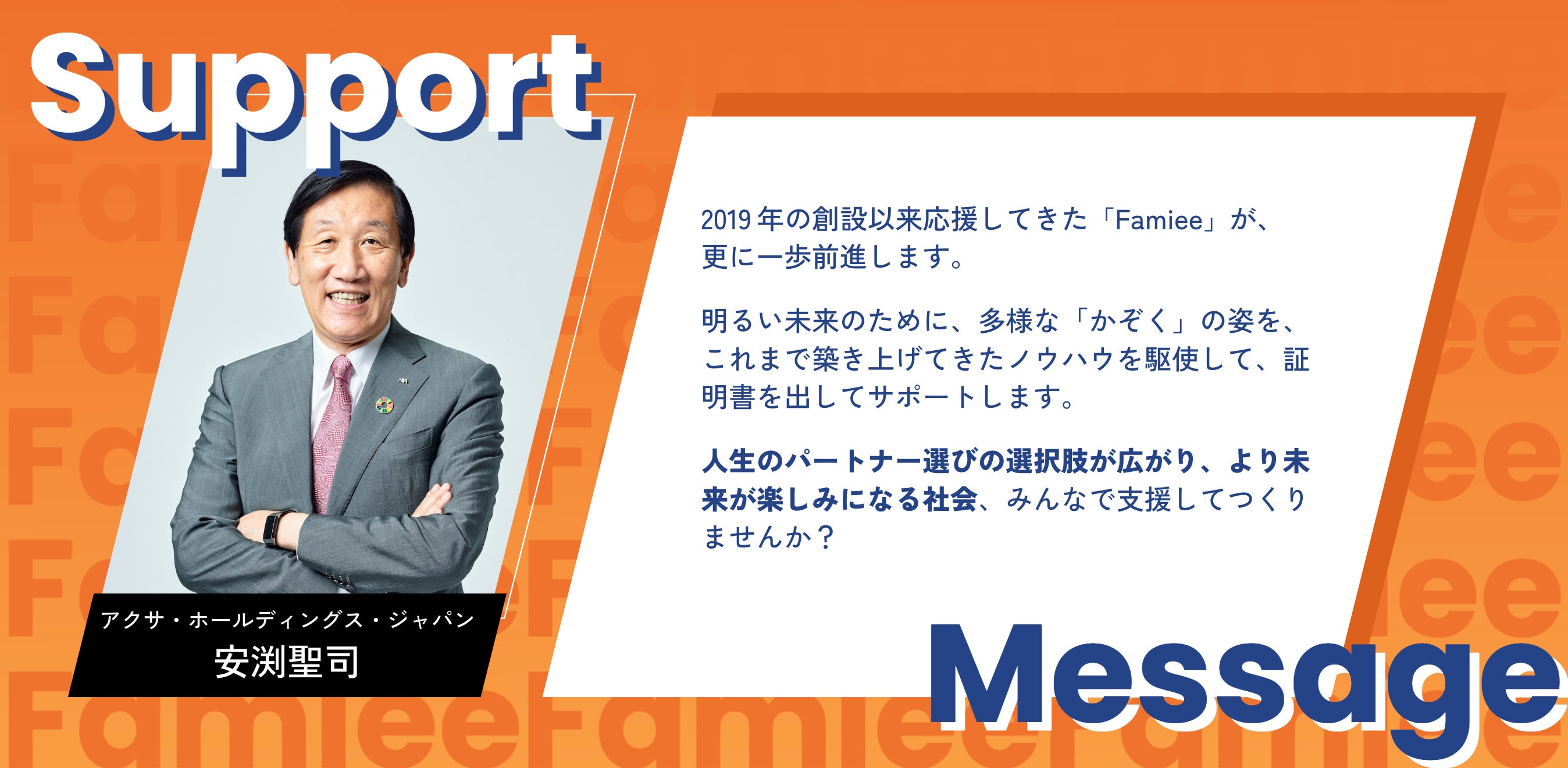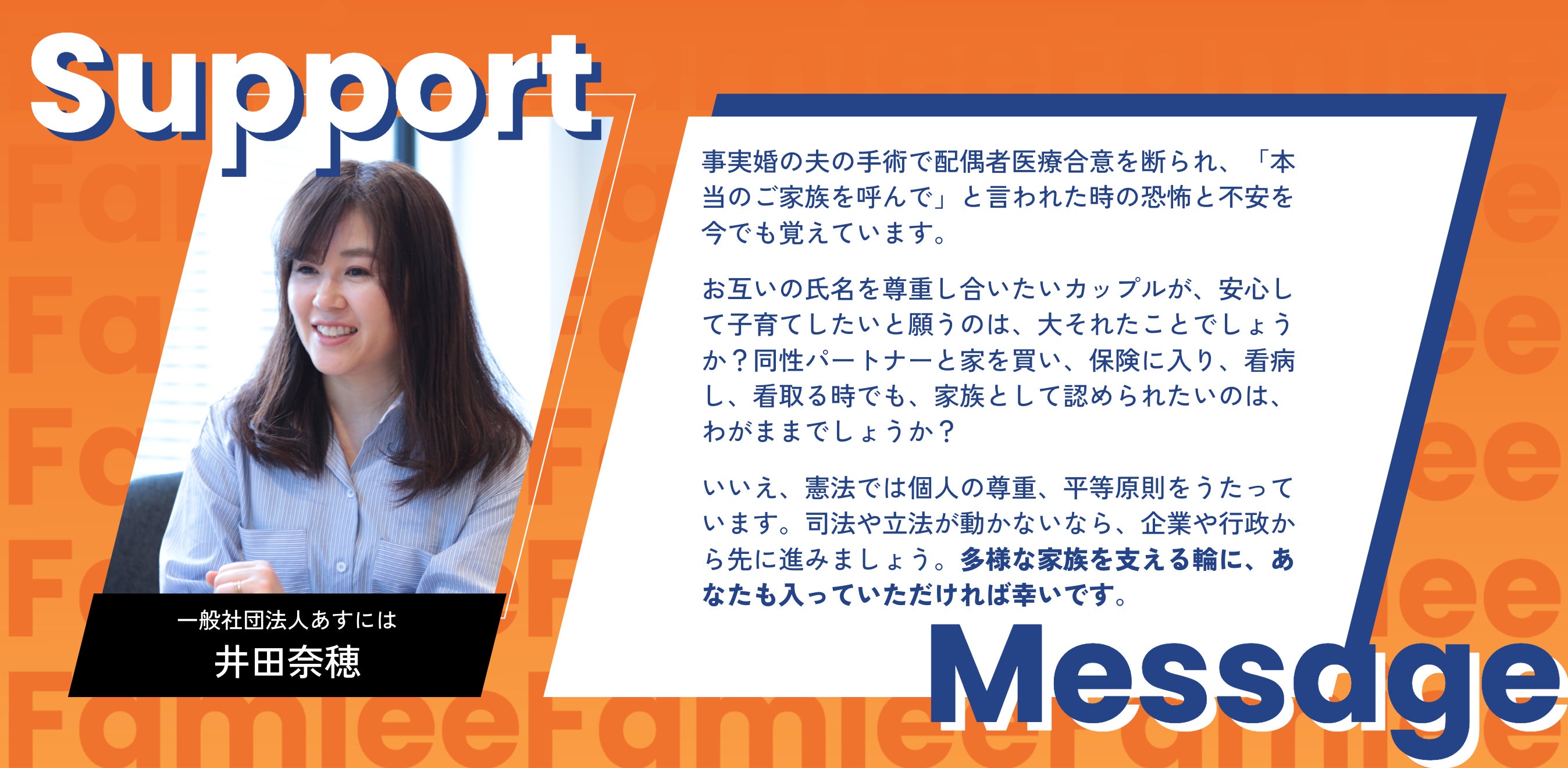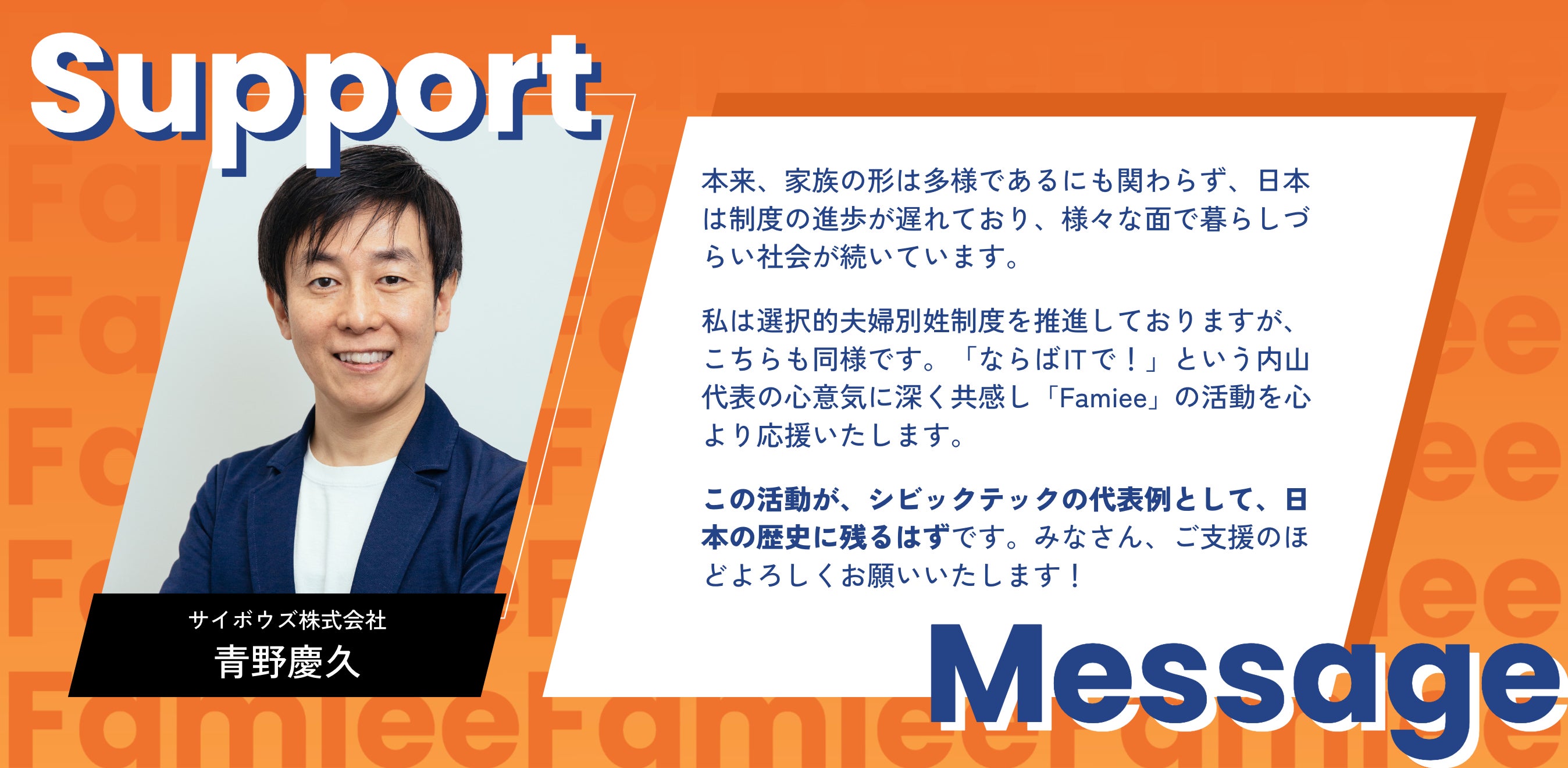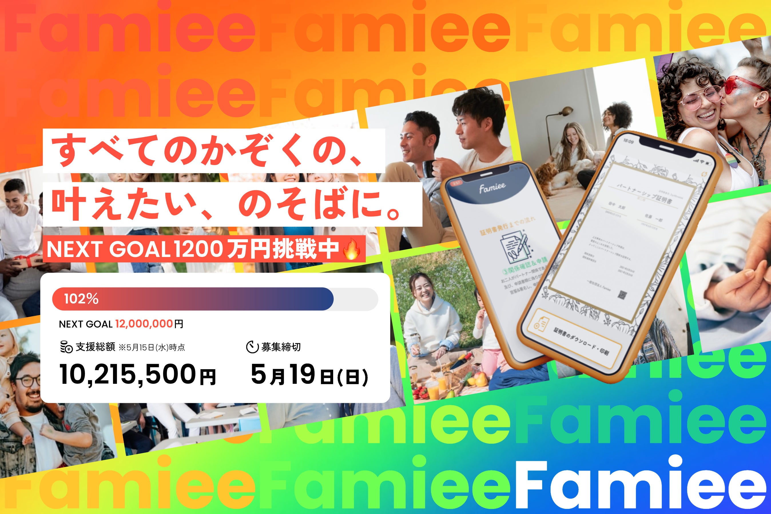 「Famiee」のサービスは、決して同性婚や夫婦別姓の実現を否定しているものではなく、制度上の同性婚や夫婦別姓の実現を応援しています。ただ、制度の変更にはかなりの時間を要するため、今現在における社会制度上の課題を解決するためにサービスの開発・拡大を進めています。