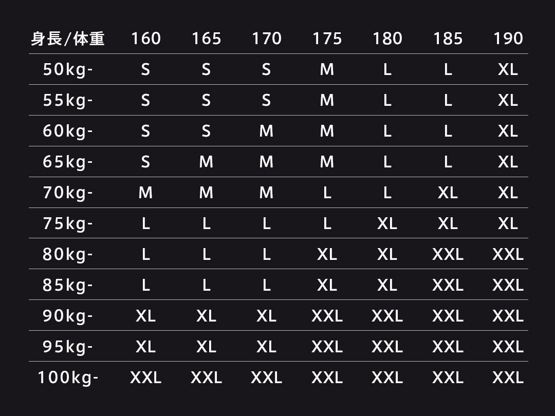 ※こちらのガイドはあくまで目安です。お手持ちのアウターのサイズと肩幅や袖丈など比較することをお勧めいたします。