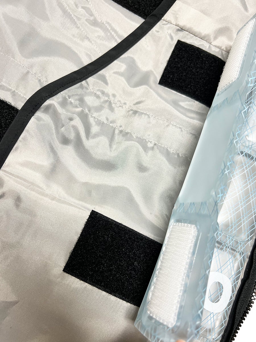 このPCMは、SUO独自のベルクロ技術によって簡単に着脱が可能で、手軽に交換できます。冷やす時はさっと外して冷蔵庫や冷凍庫に入れるだけ。何度でも繰り返しお使いいただけます。