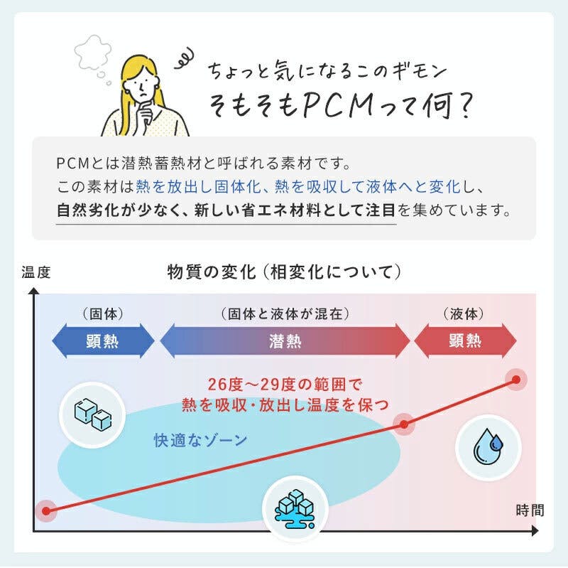 PCM(Phase Change Material:相交換物質)とは潜熱蓄熱材と呼ばれる素材です。この素材は熱を放出し固体化、熱を吸収して液体へと変化し、自然劣化が少なく、新しい省エネ材料として注目を集めています。