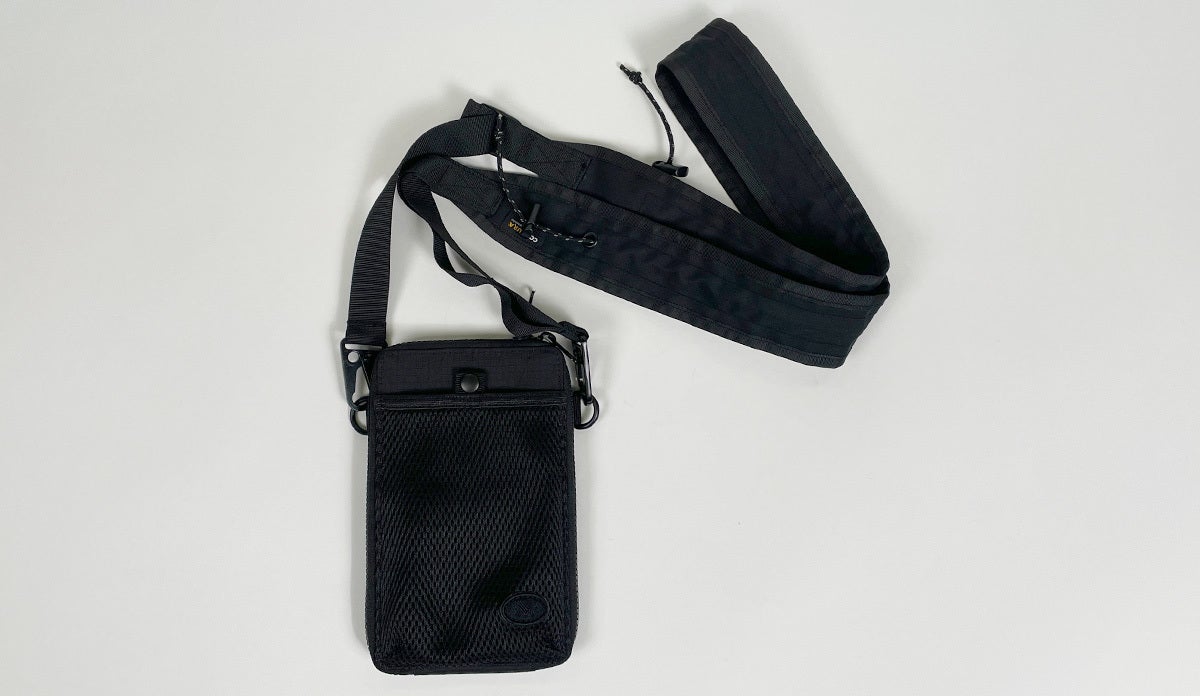 スマホポーチは表面のナイロン層、真ん中にはポリエステルを撚った紐をクロス状に合わせた高強度層、そしてポリエステル層の3層構造を圧着した特殊生地を使用したアウトドアでも活躍するギアアイテム。